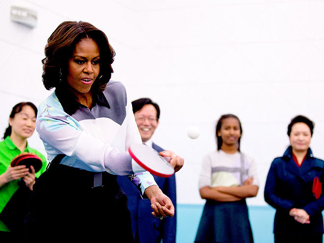 Первая леди Мишель Обама показала ее скрытый талант к игре в пинг-понг во время визита в одну из средних школ Пекина, Китай, с дочерьми Сашей и Малией в пятницу. "Мой муж играет," -заявила она собравшимся. "Он думает, что он лучше, чем я. А я вот могла бы остаться здесь на весь день."
