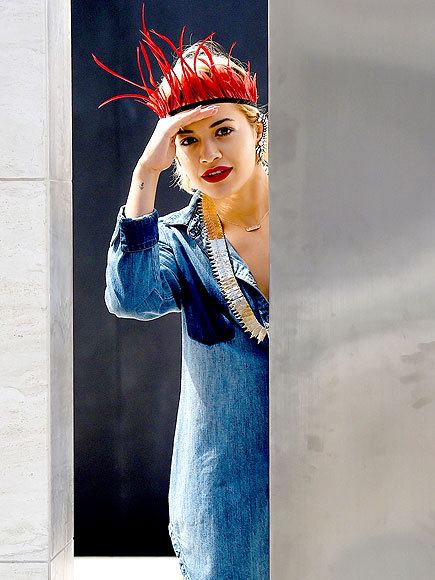 Я тебя вижу! Рита Ора выглядывает из-за стены в пернатой короне во время работы на музыкальном фестивале Coachella на MILK студии в Лос-Анджелесе в четверг.