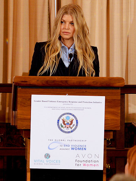 Международный Посол Благотворительного фонда Ферги поднимается на трибуну, чтобы объявить о создании нового институт юстиции инициативы против гендерного насилия – при сотрудничестве между Avon Foundation, Vital Voices и Государственного департамента по прекращению насилия в отношении женщин - в Вашингтоне, округ Колумбия, в четверг.