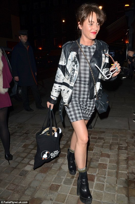 Актриса Хайме Уинстон прибыла в популярный лондонский ночной клуб в солнцезащитных очках и модном кожаном пиджаке.