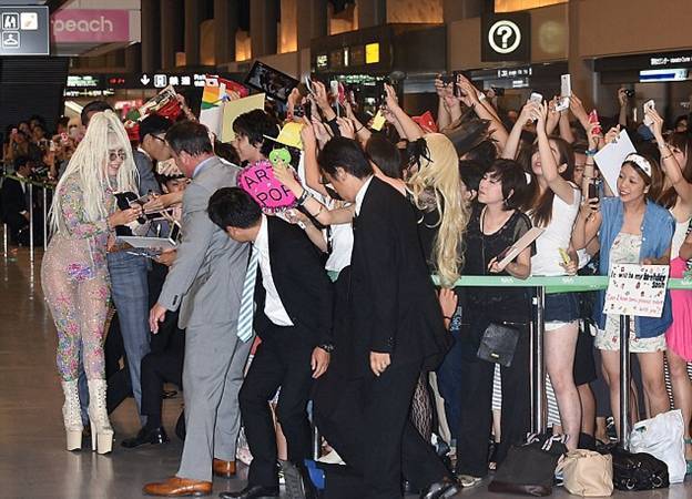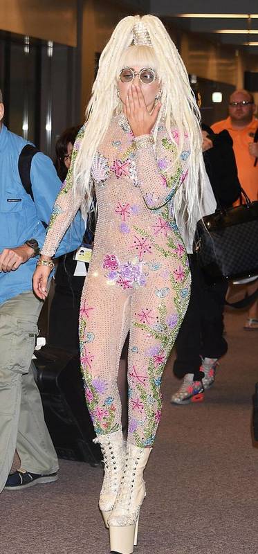 Она любит эпатировать публику своим появлением и во вторник не разочаровала своих поклонников, когда появилась в международном аэропорту Нарито. Леди Гага предстала перед фанами в белом парике и гипюровом комбинезоне, который больше открывал, чем скрывал, тем более, что ношение нижнего белья он не предусматривал.