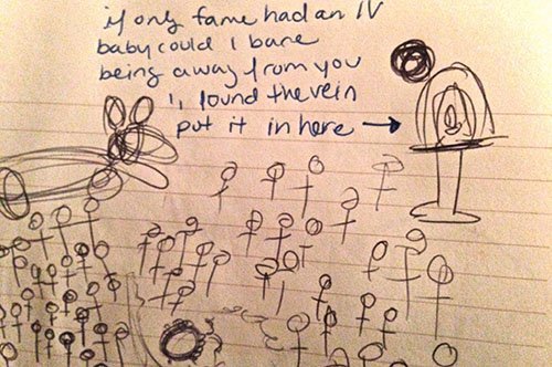 Второй же снимок показывает тетрадный лист, на котором видна работа над текстом для песни. Если перевести узнанные слова то получится: «Если бы была слава IV, малыша я несу, находясь вдали от тебя…». Подпись под фотографиями гласит: «Это документ к моему альбому, приложение к ARTPOP, я проектирую издать серию заметок, эскизов, т.е. всего, что к нему относится».