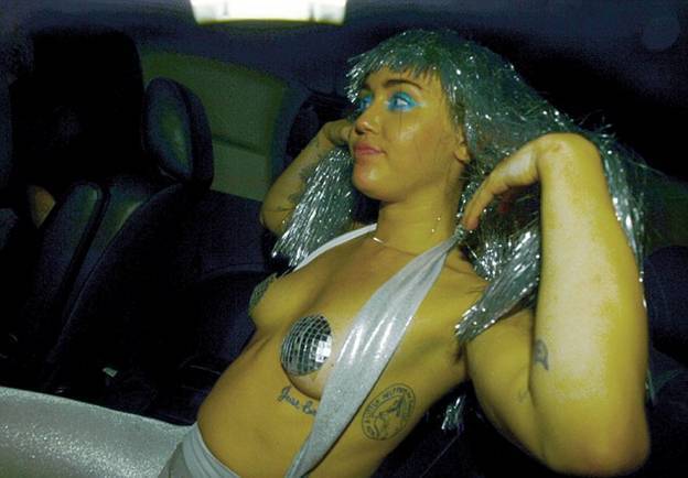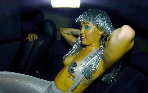 Вечером же, прибыв на концерт, она произвела фурор одним своим внешним видом. Парик из мишуры, блестящие колготки на голое тело, сверху них стринги, ну и небольшие блестящие кружочки на сосках, чтобы формально соблюсти правила приличия. Однако многие СМИ открыто написали, что Майли Сайрус прибыла на свой концерт в Майами топлесс.