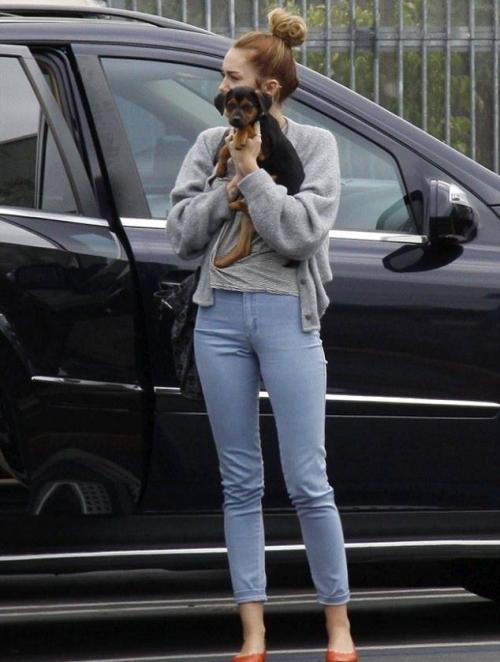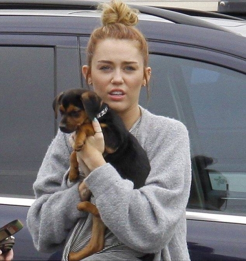 19-летняя актриса несла щенка на руках, так как он немного нервничал. Надо заметить, что эту дворнягу Майли подобрала на прошлой неделе на улице, а именно в коробке возле здания супермаркета, где актриса постоянно делает покупки.