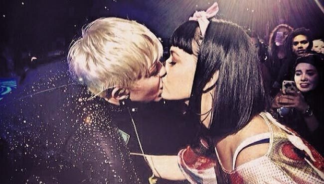 Во время субботнего концерта Майли Сайрус, который проходил в рамках мирового турне «Bangerz» в Staples Center, Лос-Анджелес, в зале была замечена Кэти Перри. В один из моментов шоу Майли села на край сцены и поманила мисс Перри к себе, явно демонстрируя намерение поцеловать девушку. Кэти подставила щеку, но Майли была полна решимости насладиться поцелуем в губы.