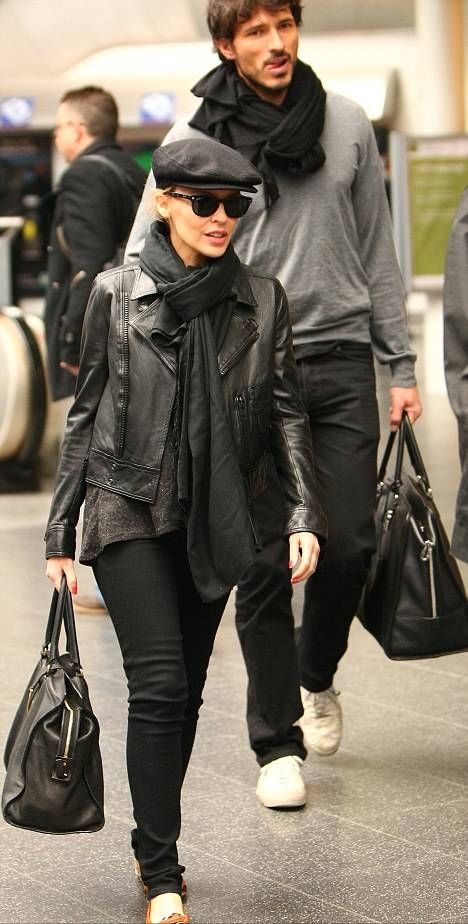 Кайли возвращалась в Лондон после своего воскресного выступления в Manchester Academy, проходившее в рамках ее «Анти-Тура», который певица начала более двух недель назад в Австралии. 43-летнию певицу сопровождал испанский манекенщик Андрес Валенкосо, с которым она встречается с конца 2008 года. И хотя у них очень различается рост, одежду они подобрали в одинаковых тонах, даже их сумки смотрелись идентично.