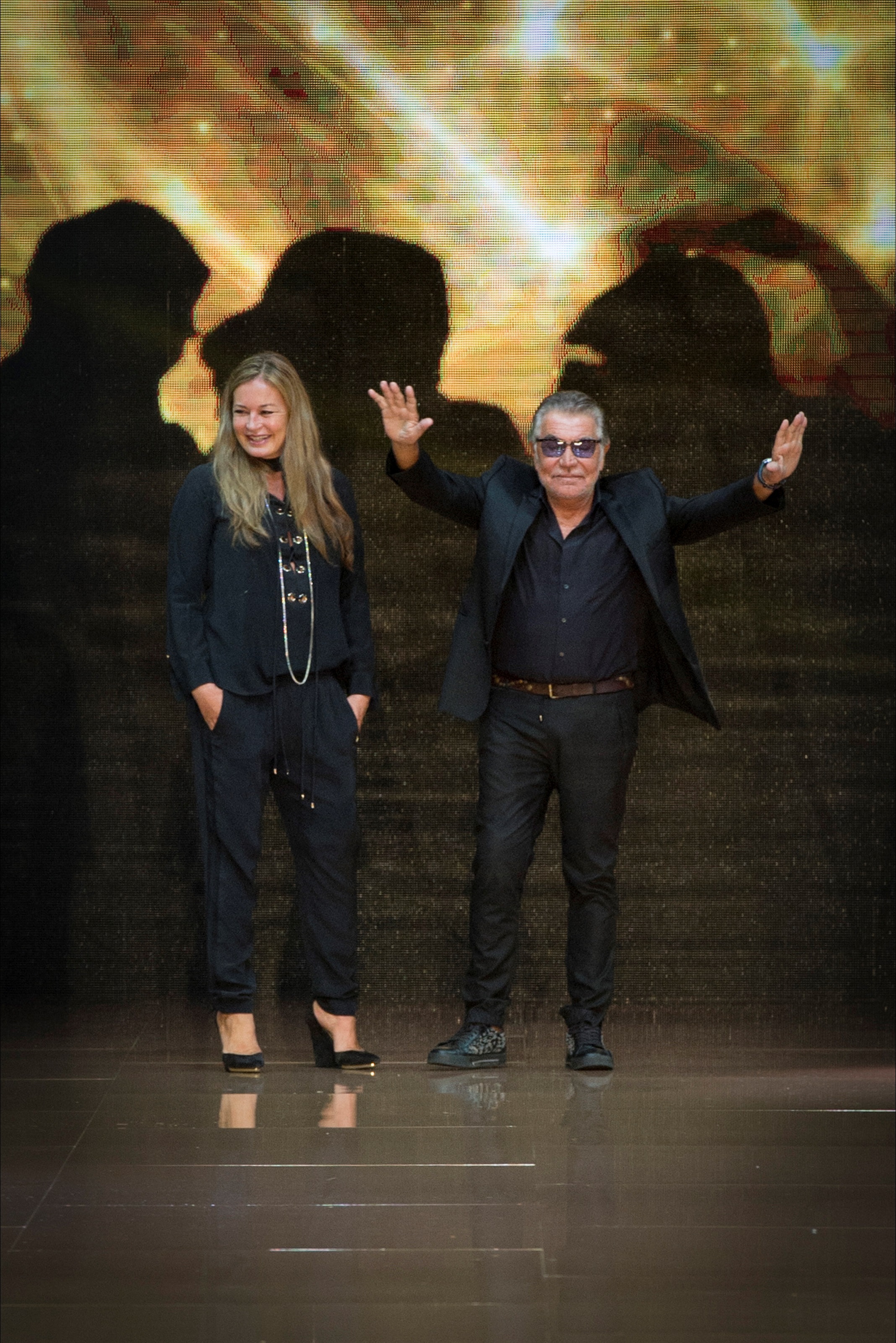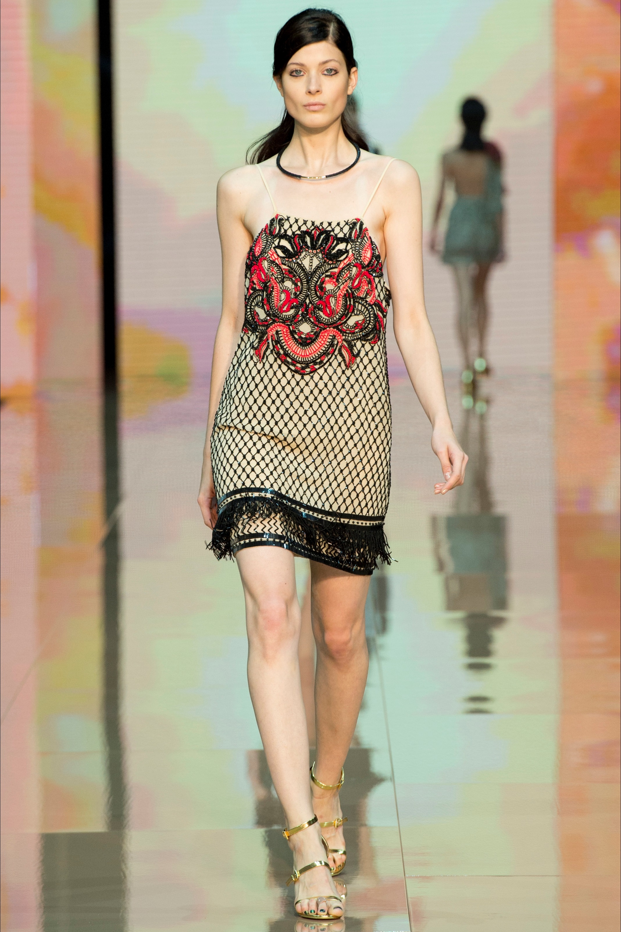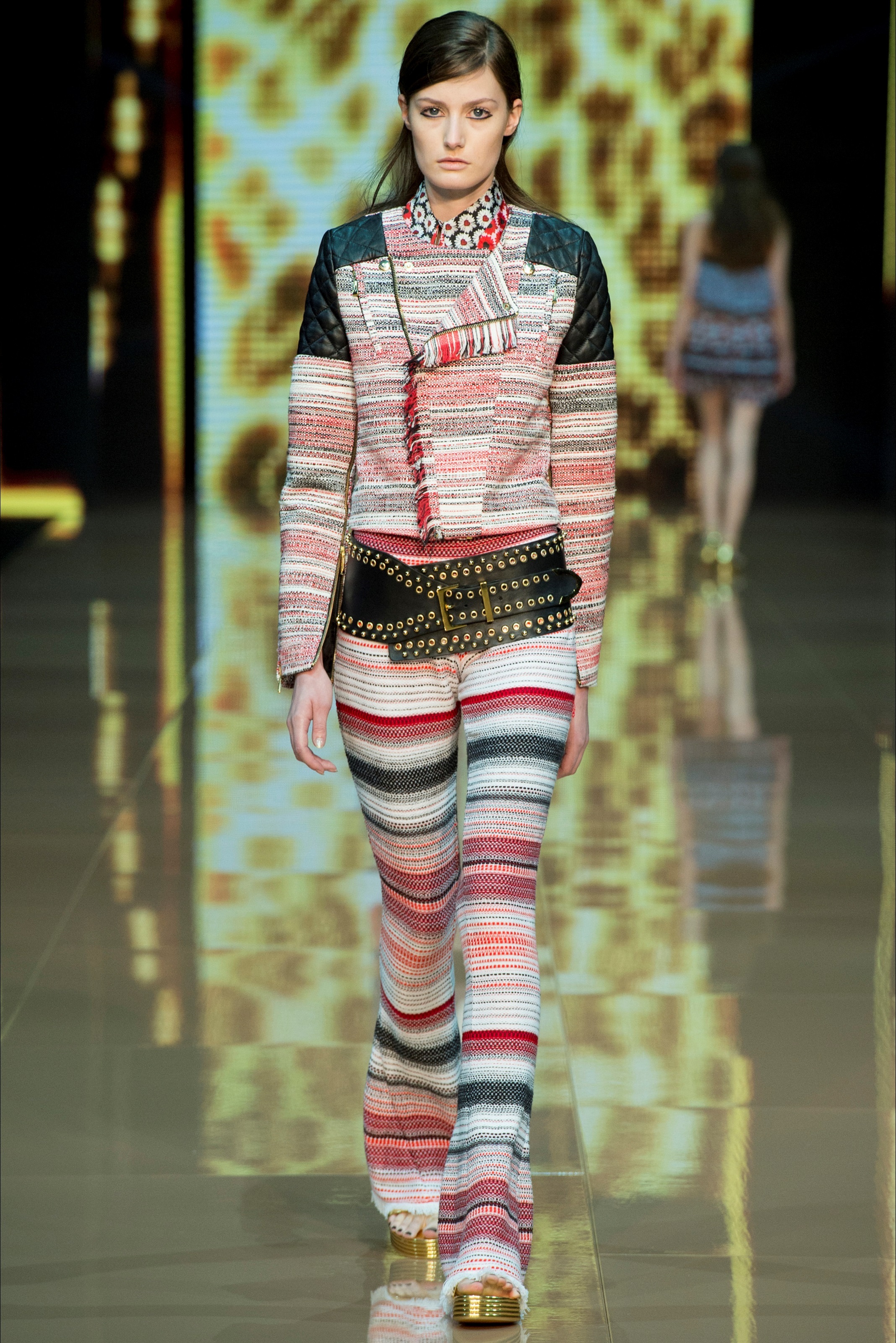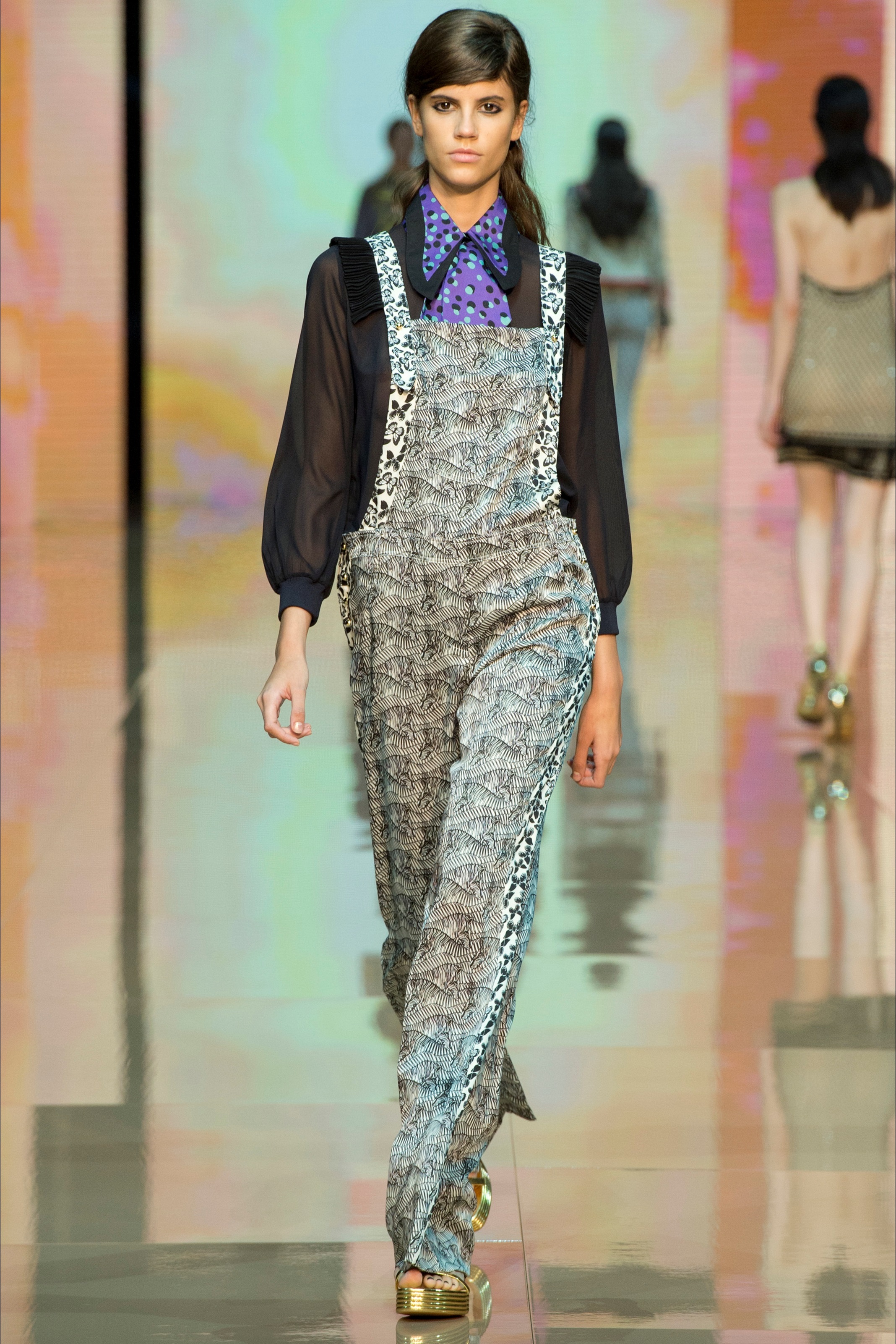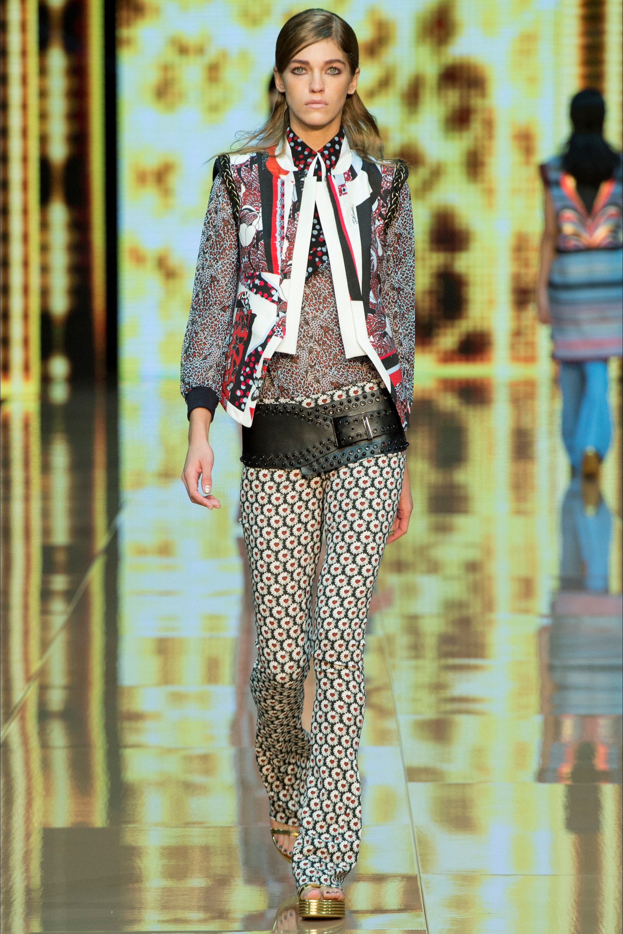 Дизайнер и модный вдохновитель Роберто Кавали в коллекции весна/лето 2015 остался верен себе. Нет, на это раз вы не увидите традиционные изображения животных, но созданный мир мерцающих принтов на легких платьях и смокингах, расклешенных брюках и аксессуарах заиграет в вашем воображении яркими красками с отголосками силуэтов 60-70-х годов.
