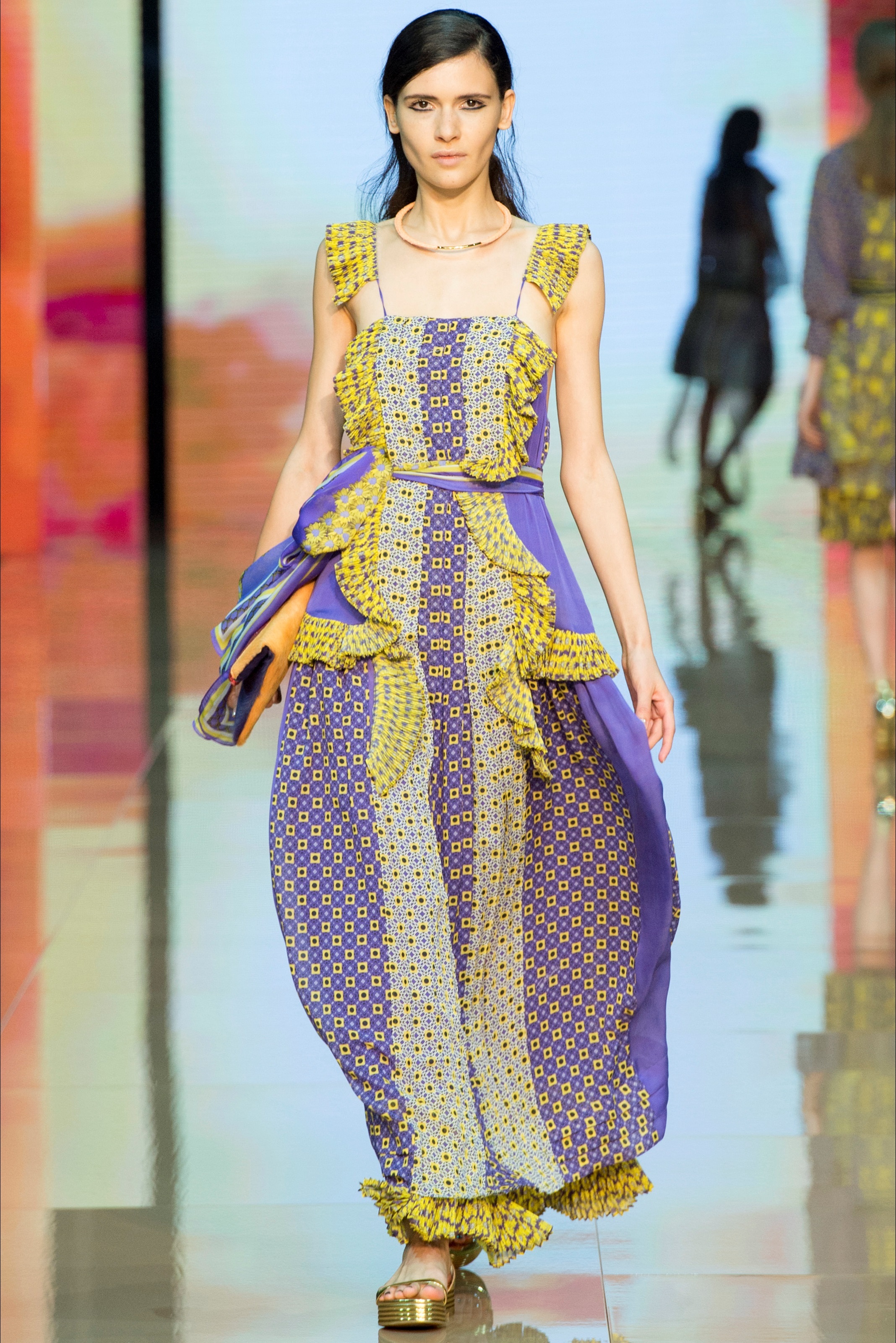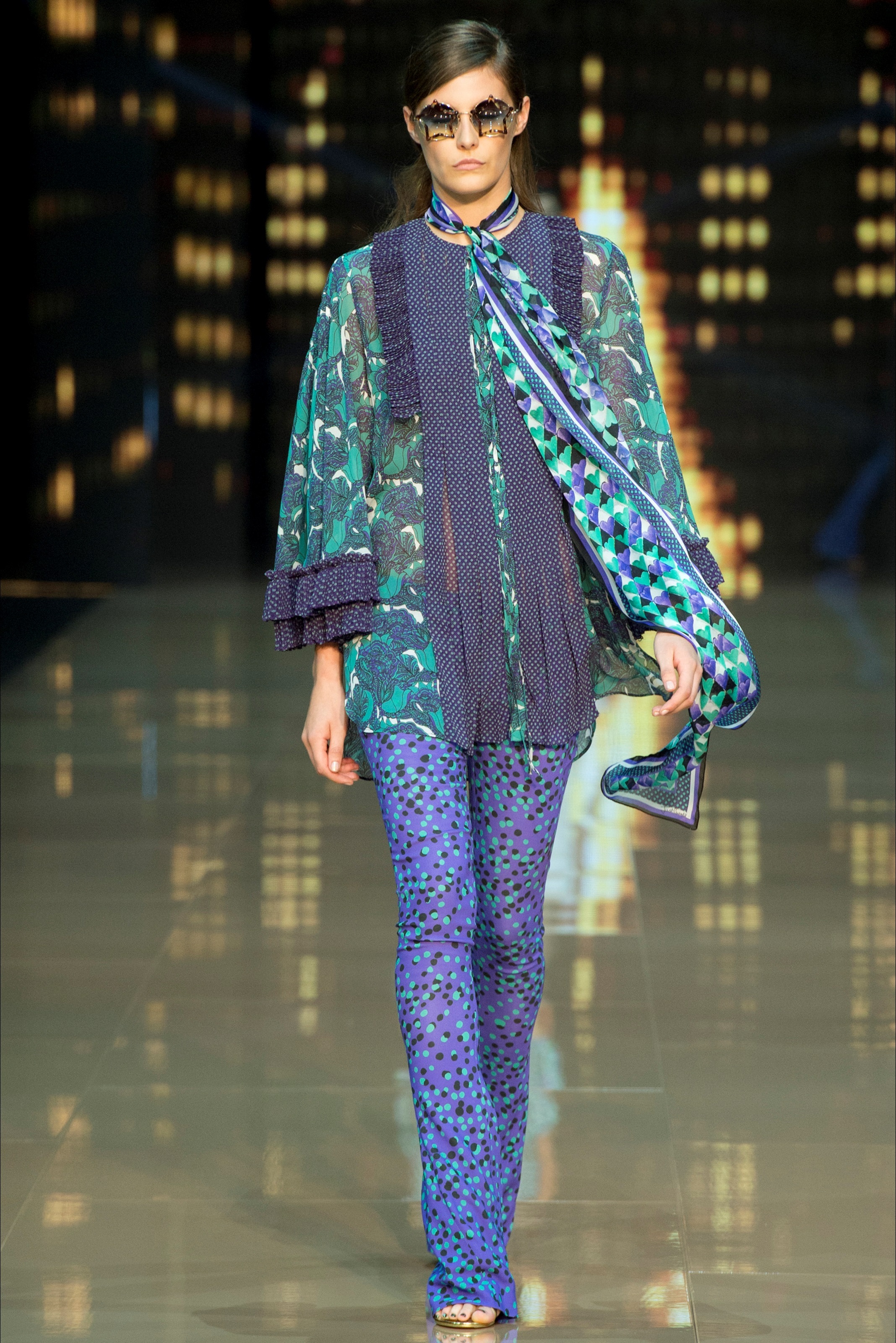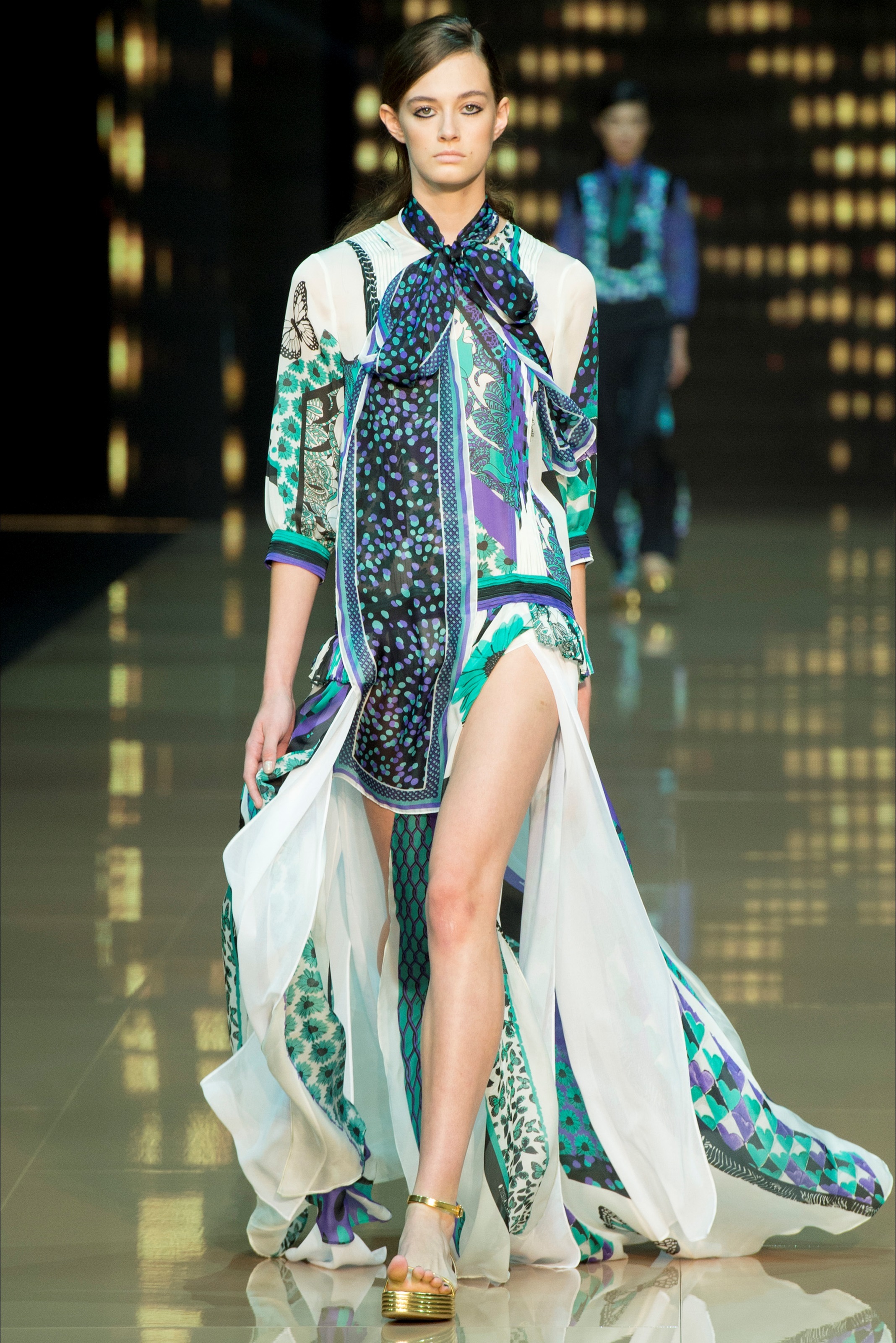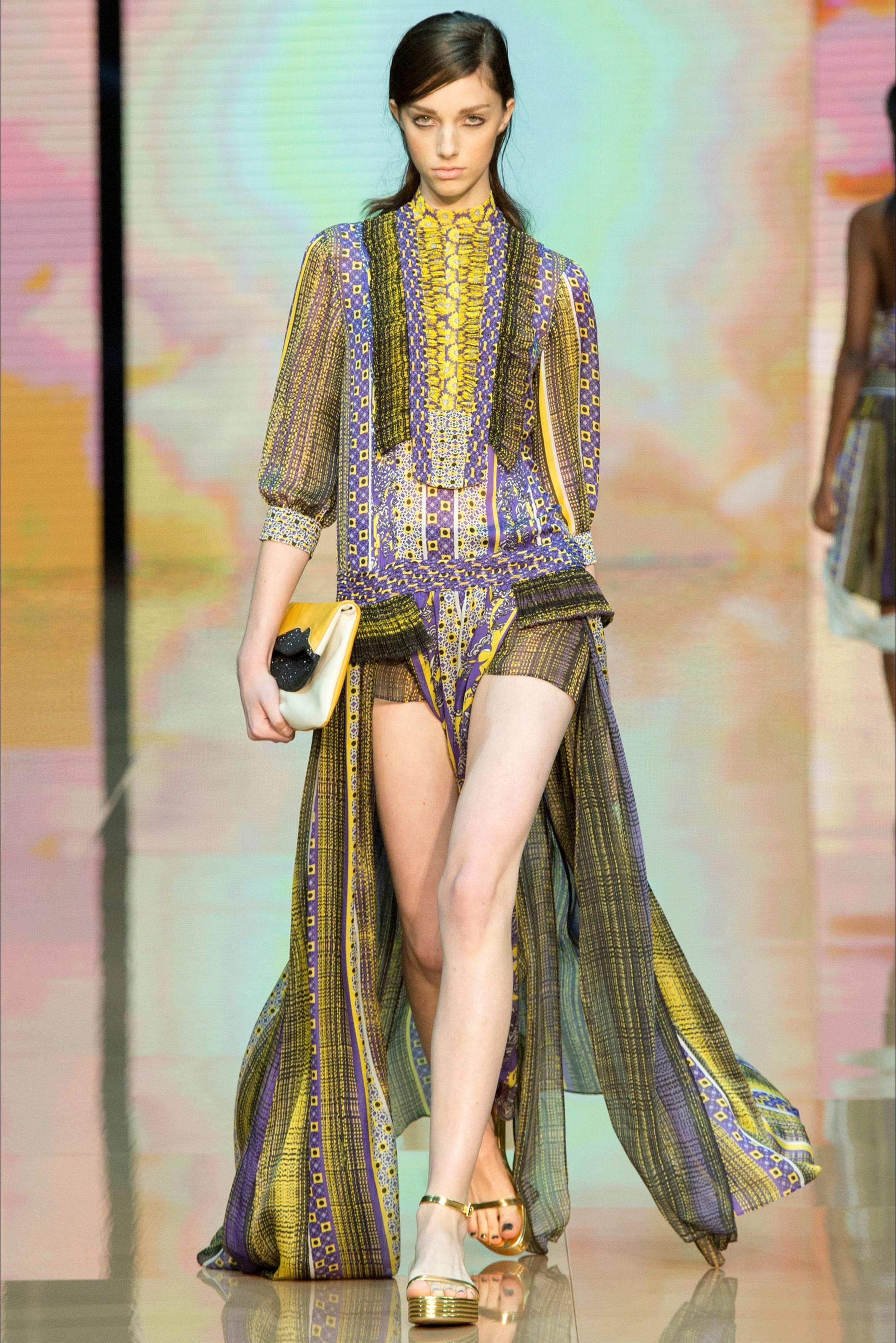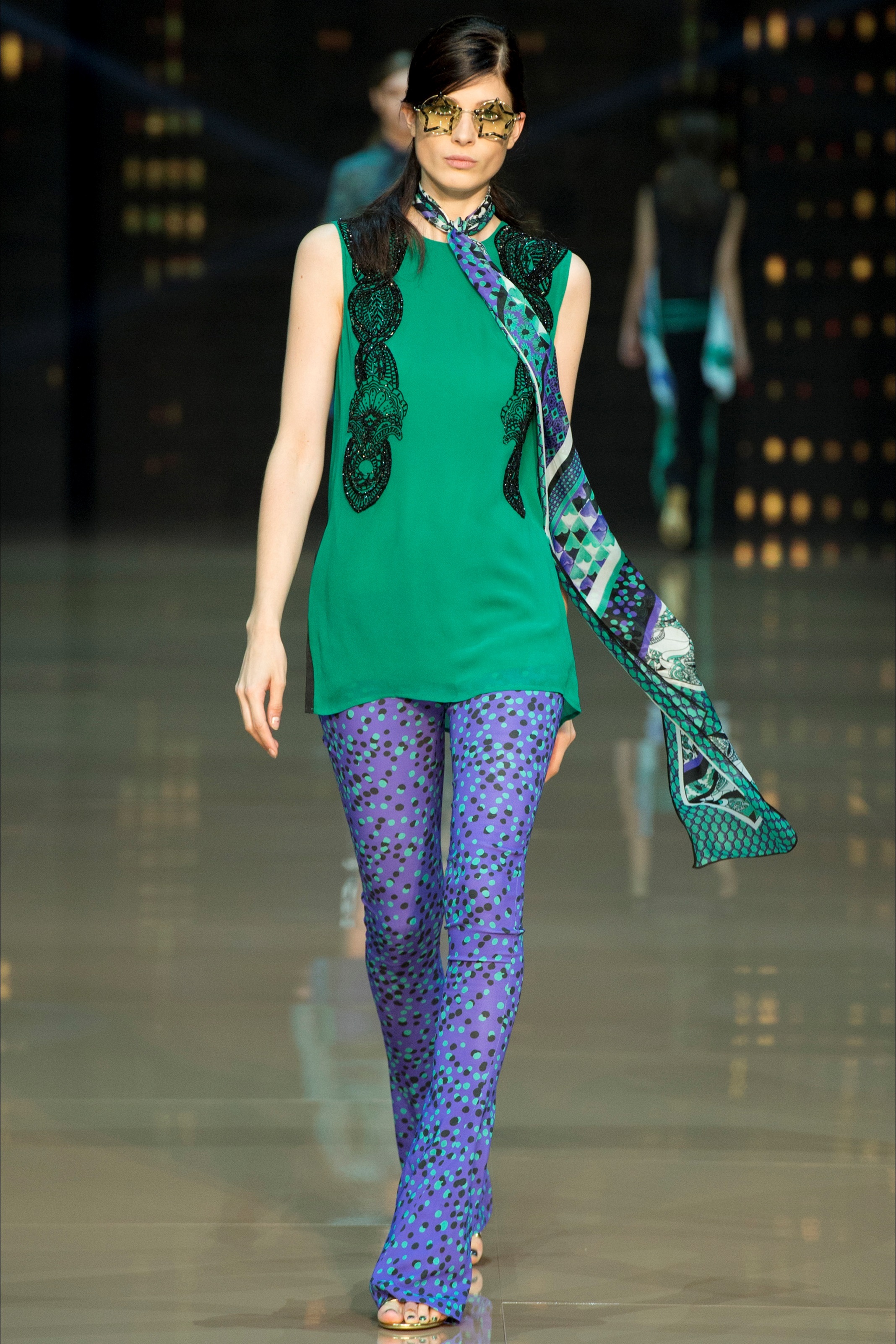 Дизайнер и модный вдохновитель Роберто Кавали в коллекции весна/лето 2015 остался верен себе. Нет, на это раз вы не увидите традиционные изображения животных, но созданный мир мерцающих принтов на легких платьях и смокингах, расклешенных брюках и аксессуарах заиграет в вашем воображении яркими красками с отголосками силуэтов 60-70-х годов.
