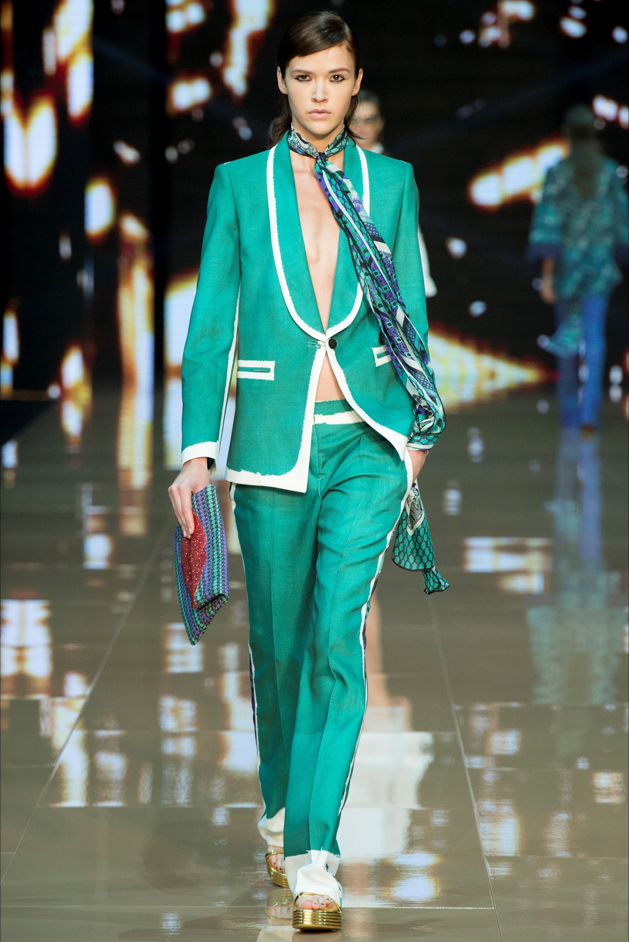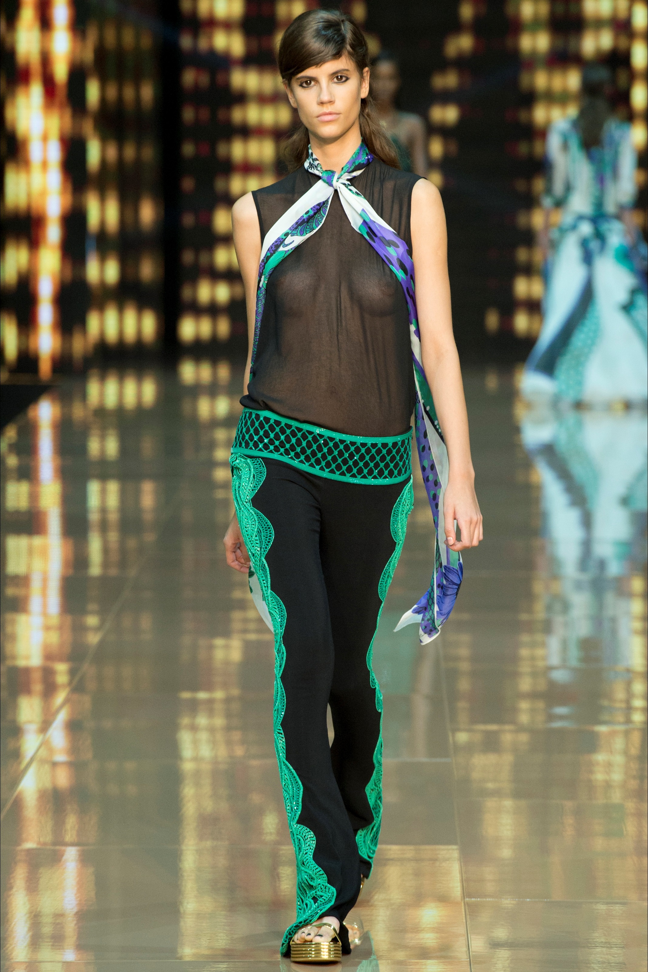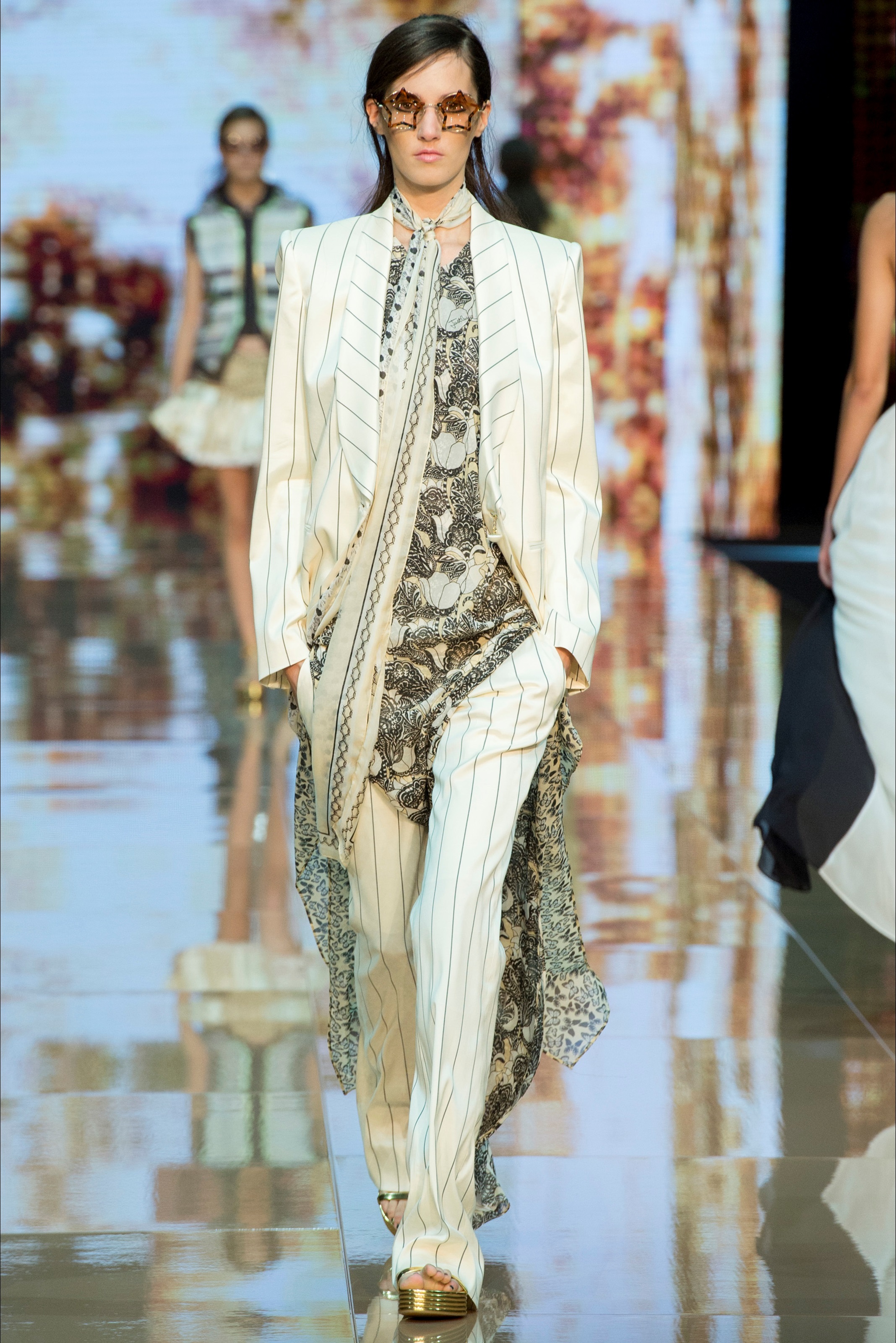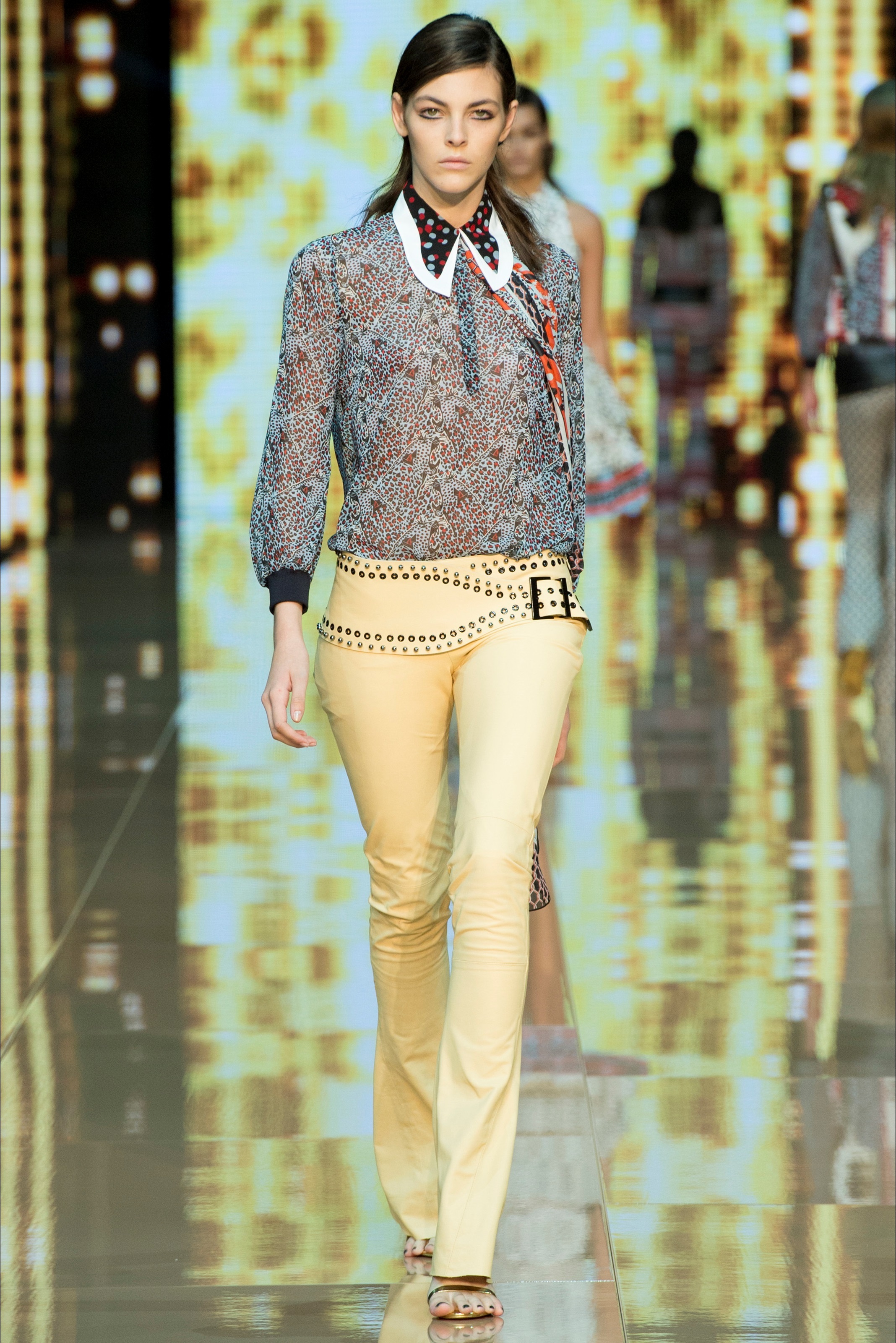 Основной акцент Кавалли сделал на принтах. Дизайнерская мозаика прослеживается в каждом изделии: в шифоновых платьях, смокингах пляжного вида, легких блузах, расклешенных штанах и даже шелковых платках, которые Кавалли мастерски применил в виде топов. Посыл дизайнера мы распознали - следующее лето - пора ярких эмоций и легкой расслабленности.