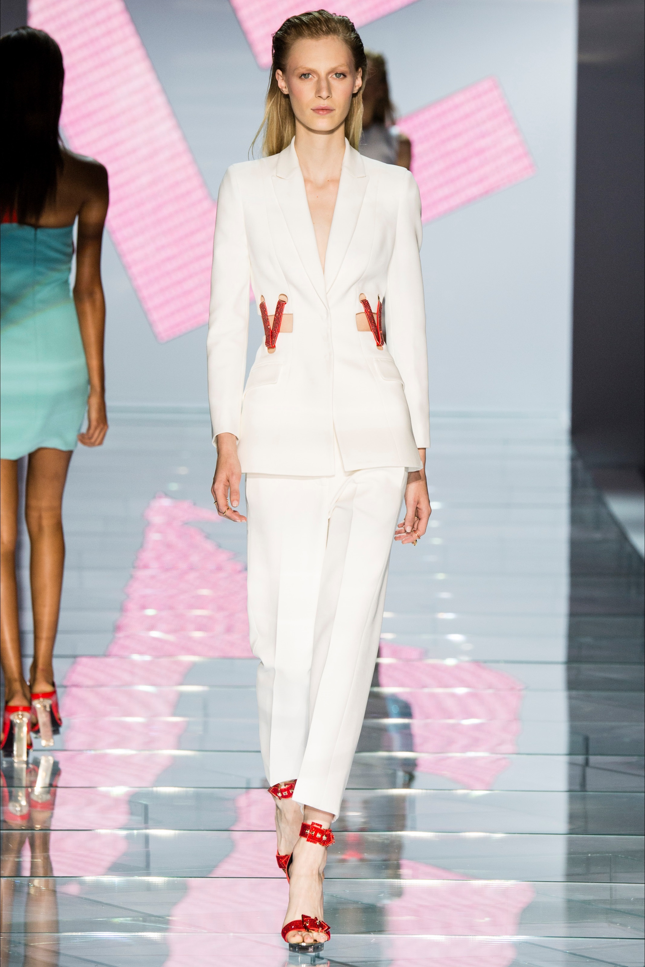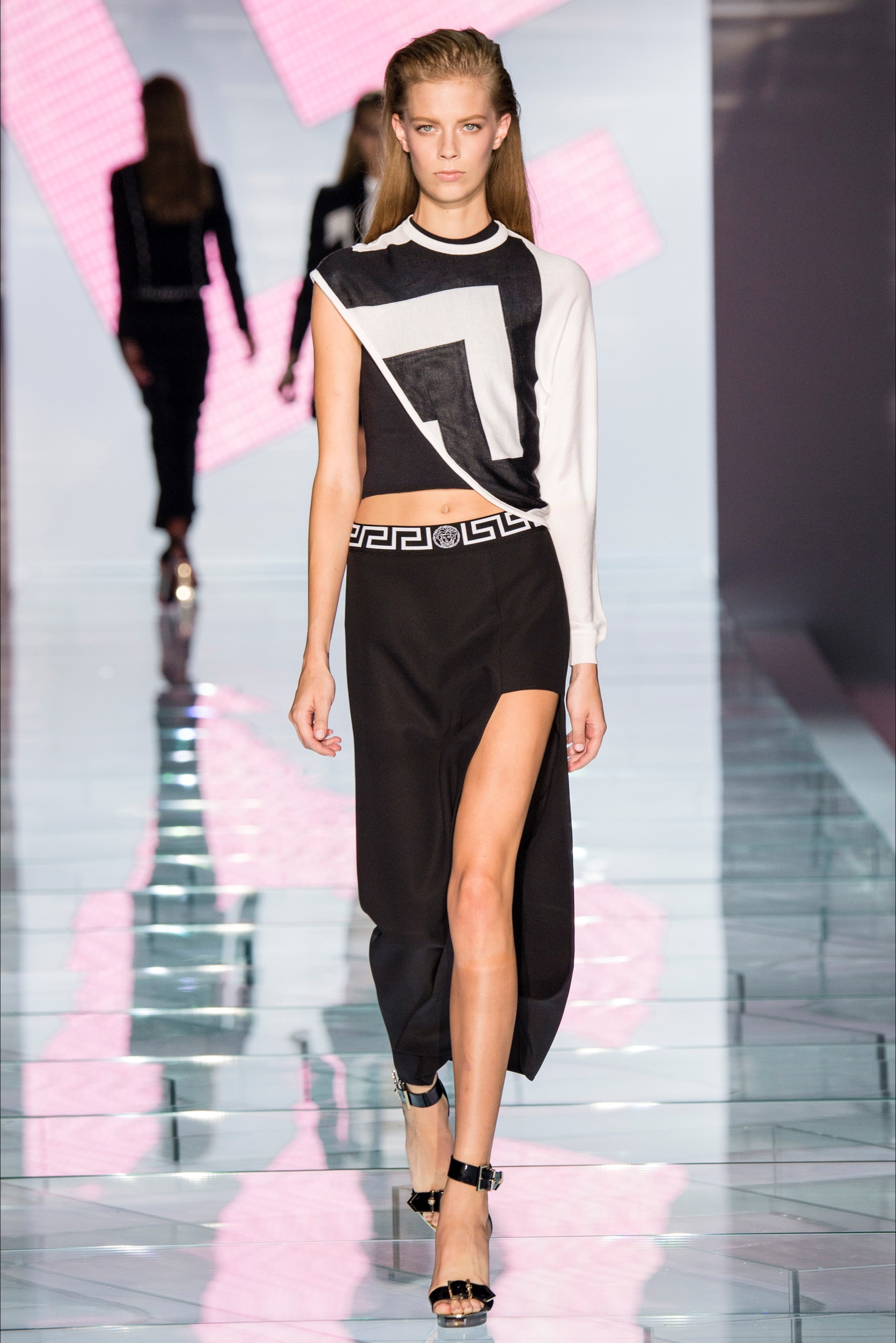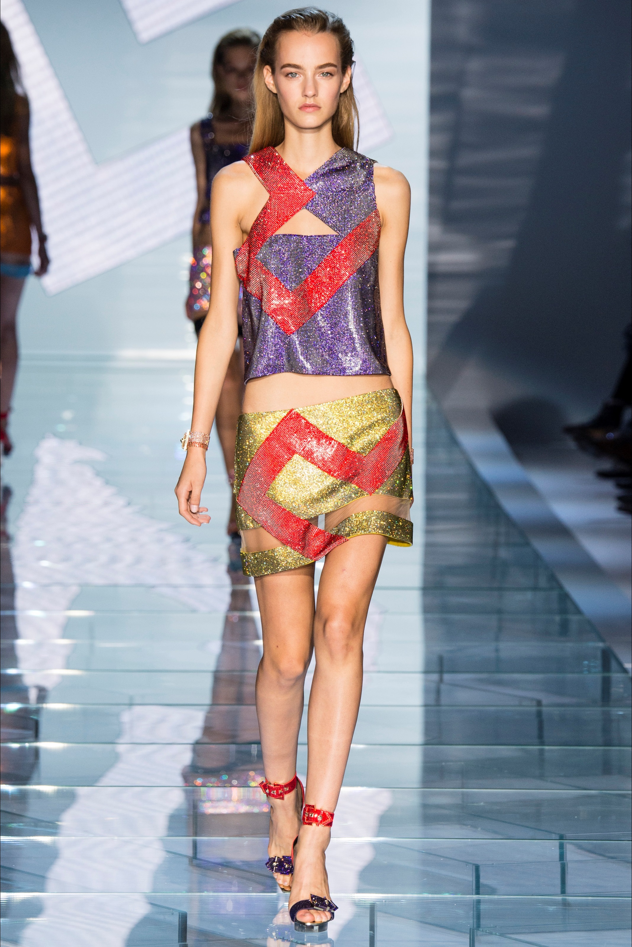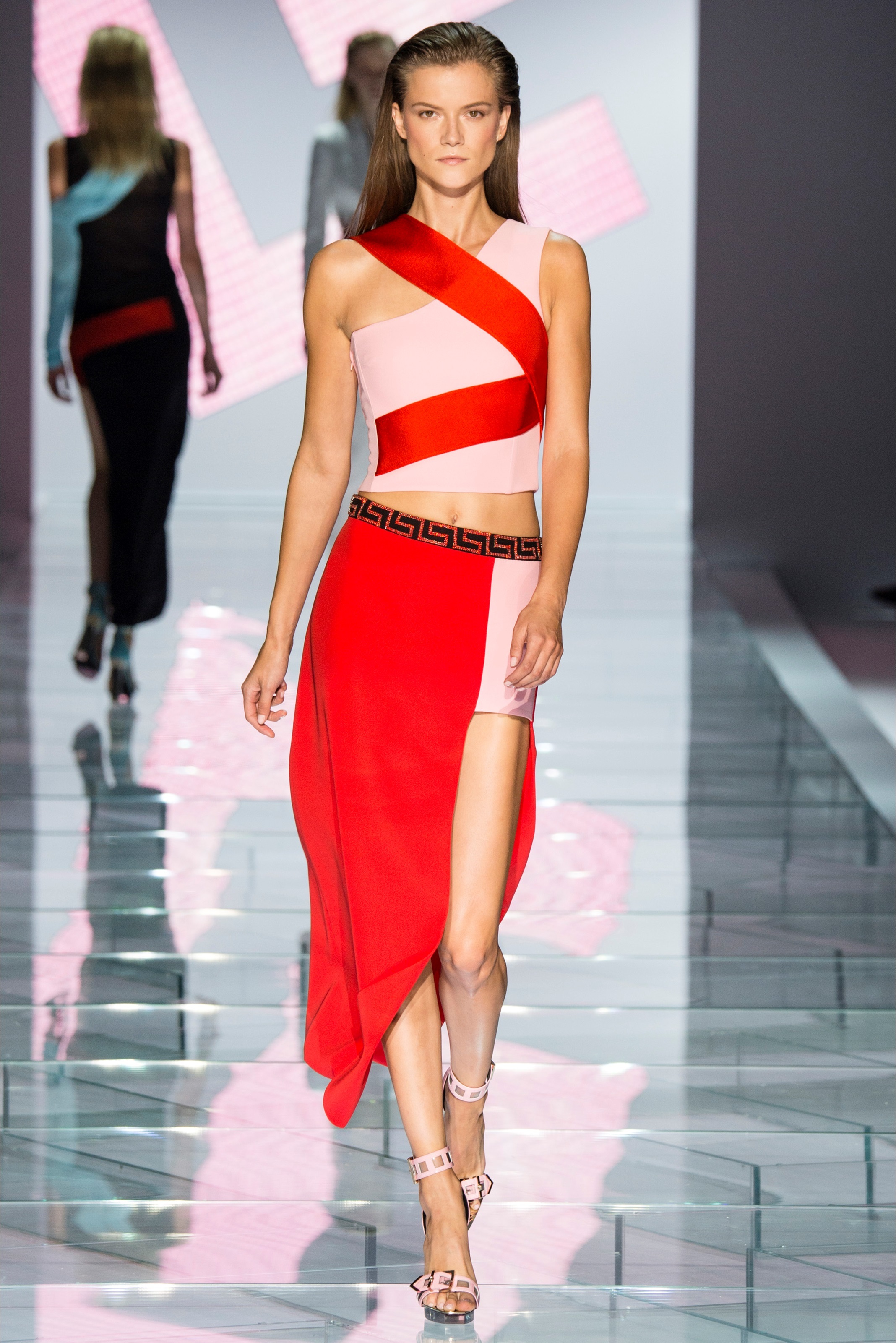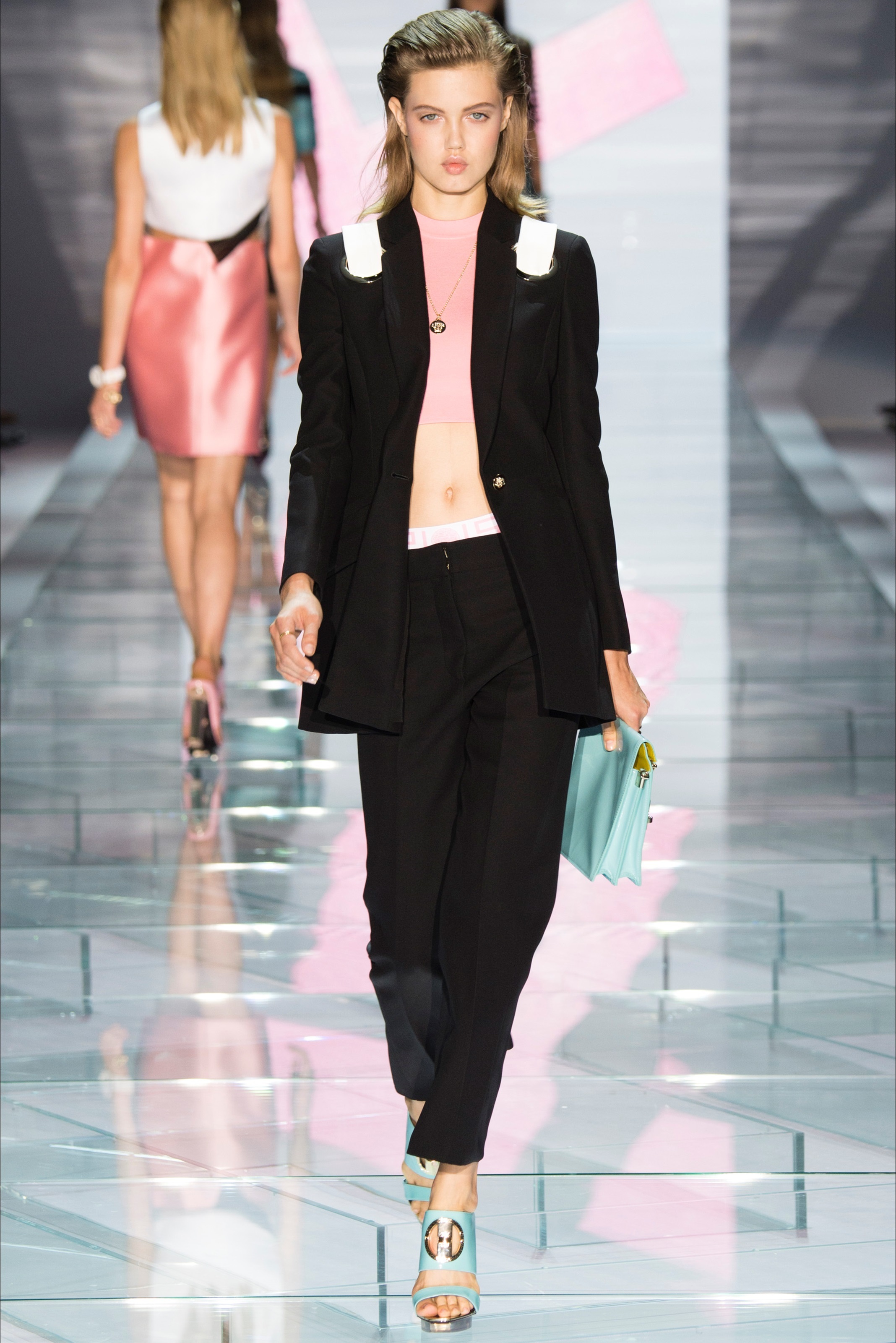 Предлагаю проследить как постепенно развивается шоу форм и цвета в новой коллекции весна/лето 2015 от модного дома Versace на показе во время Недели моды в Милане. Показ открывается черный пиджак на одной пуговице со множеством декоративны строчек, которые подчеркивают линейный силуэт одежды; укороченный топ и юбка с глубоким боковым разрезом.