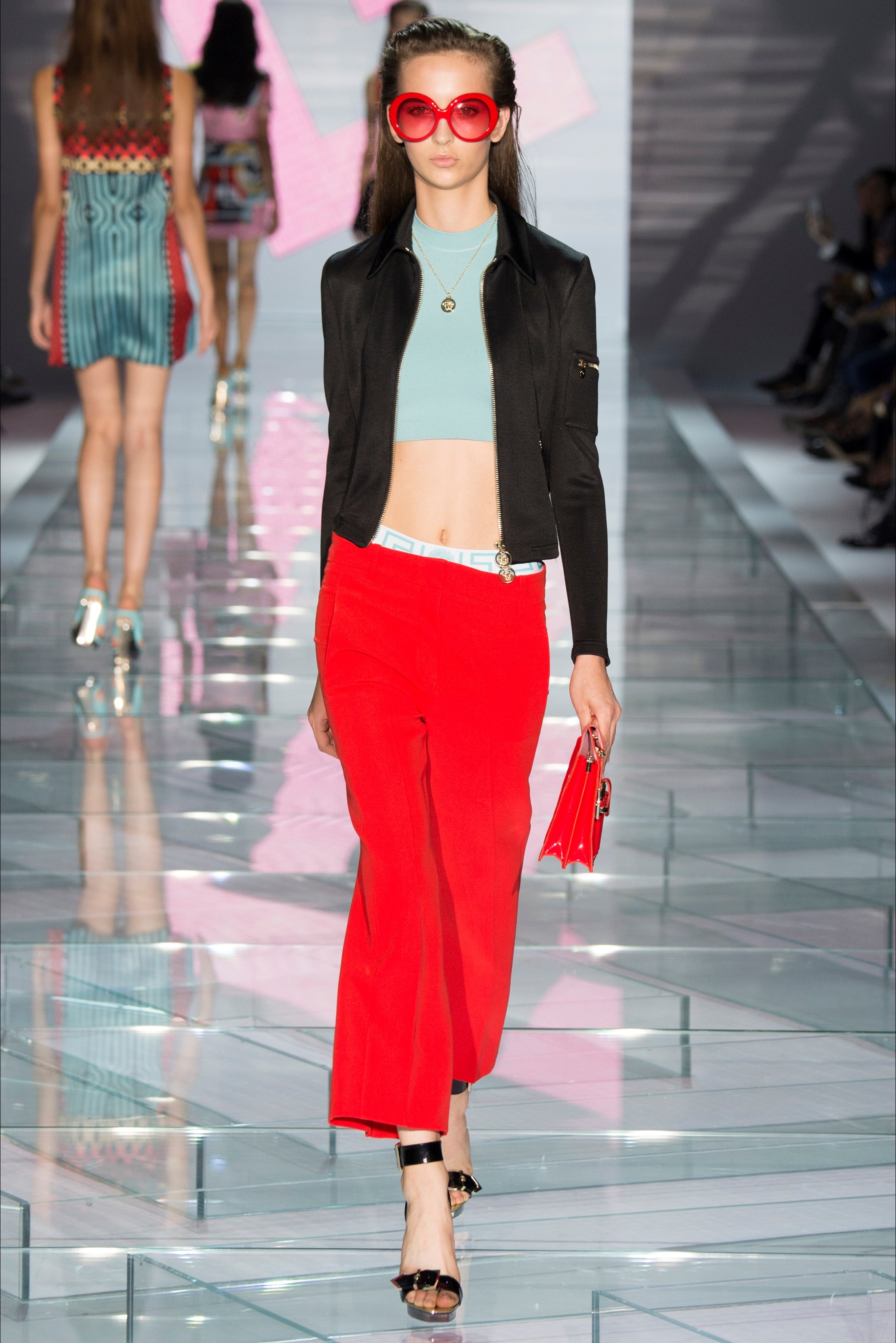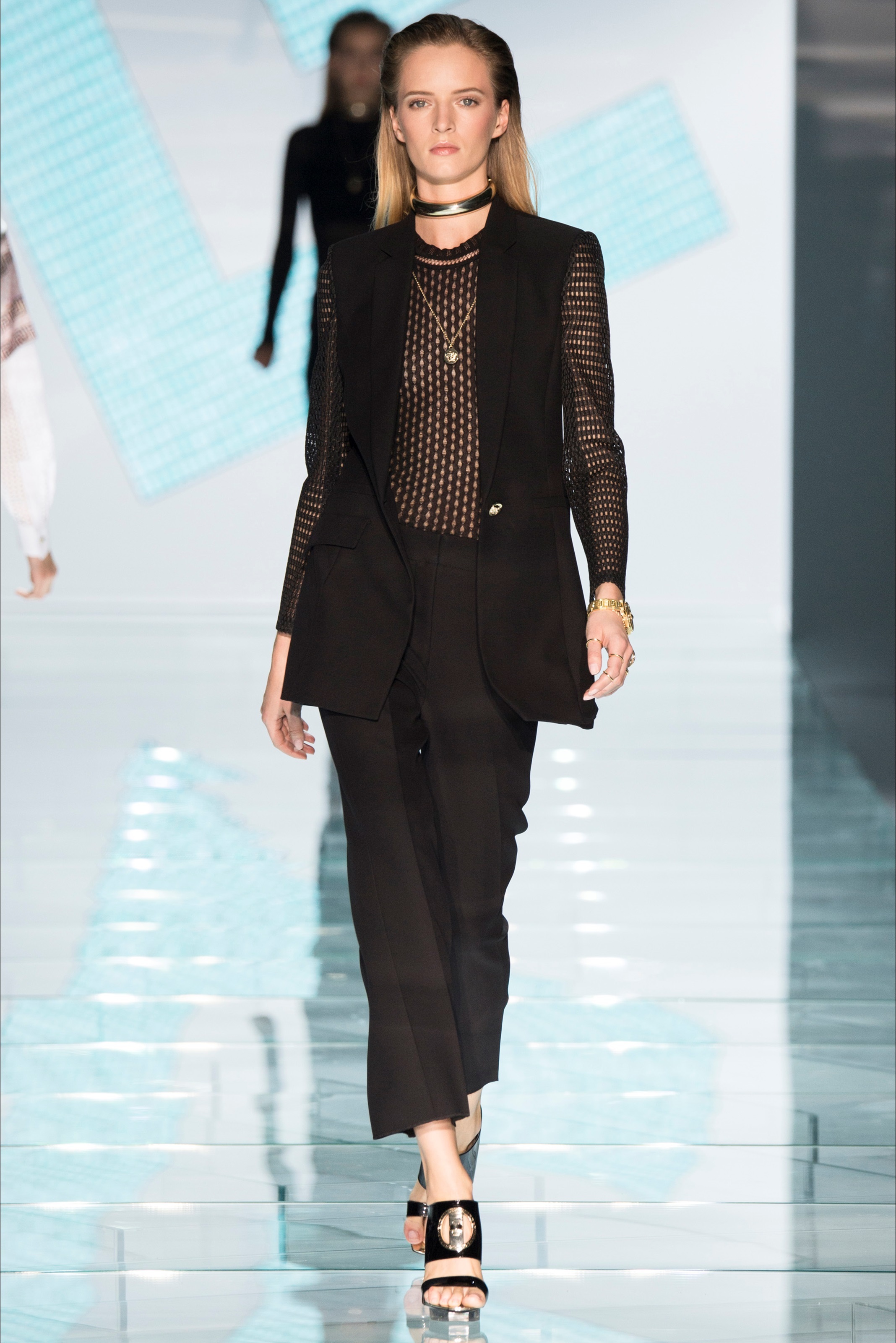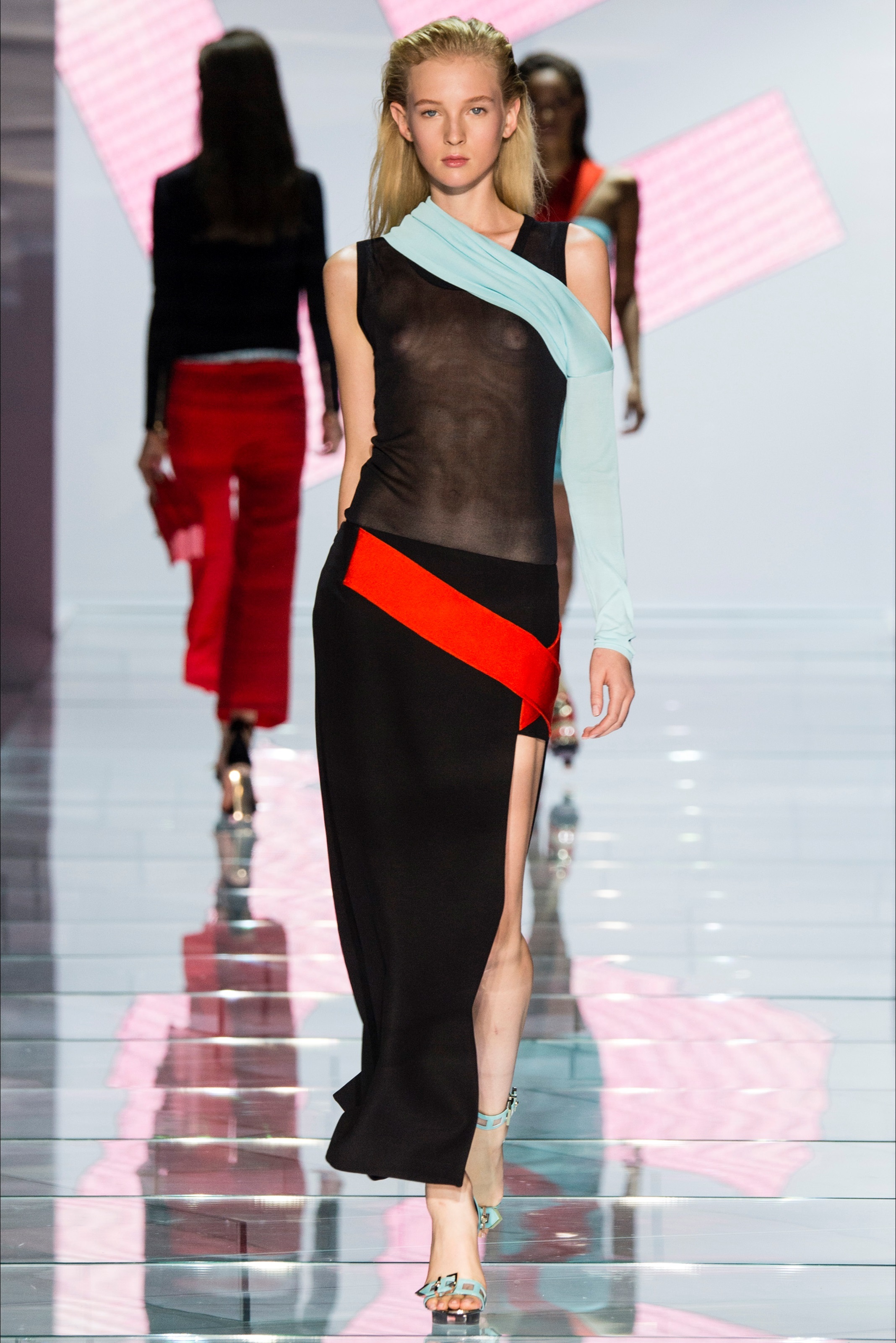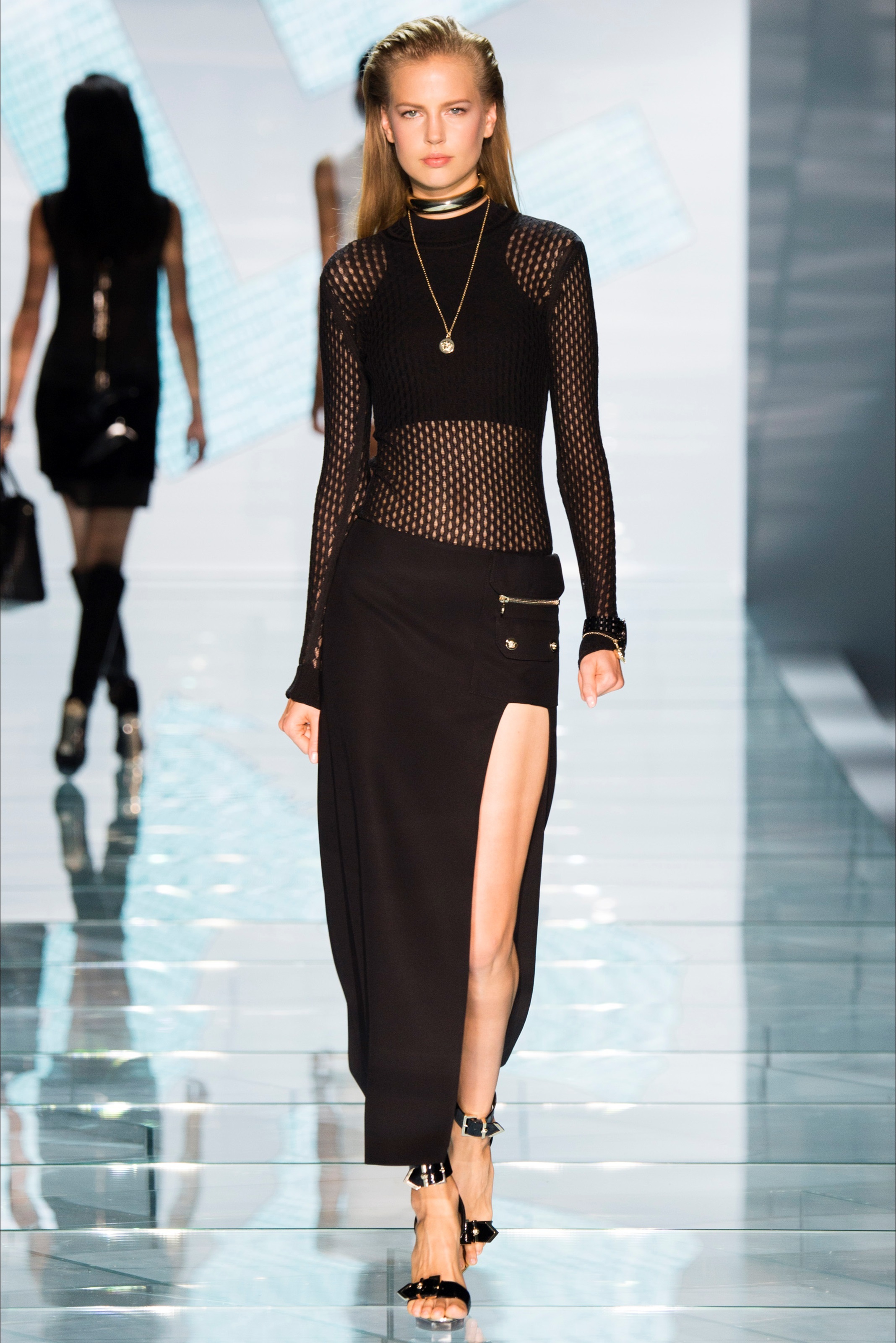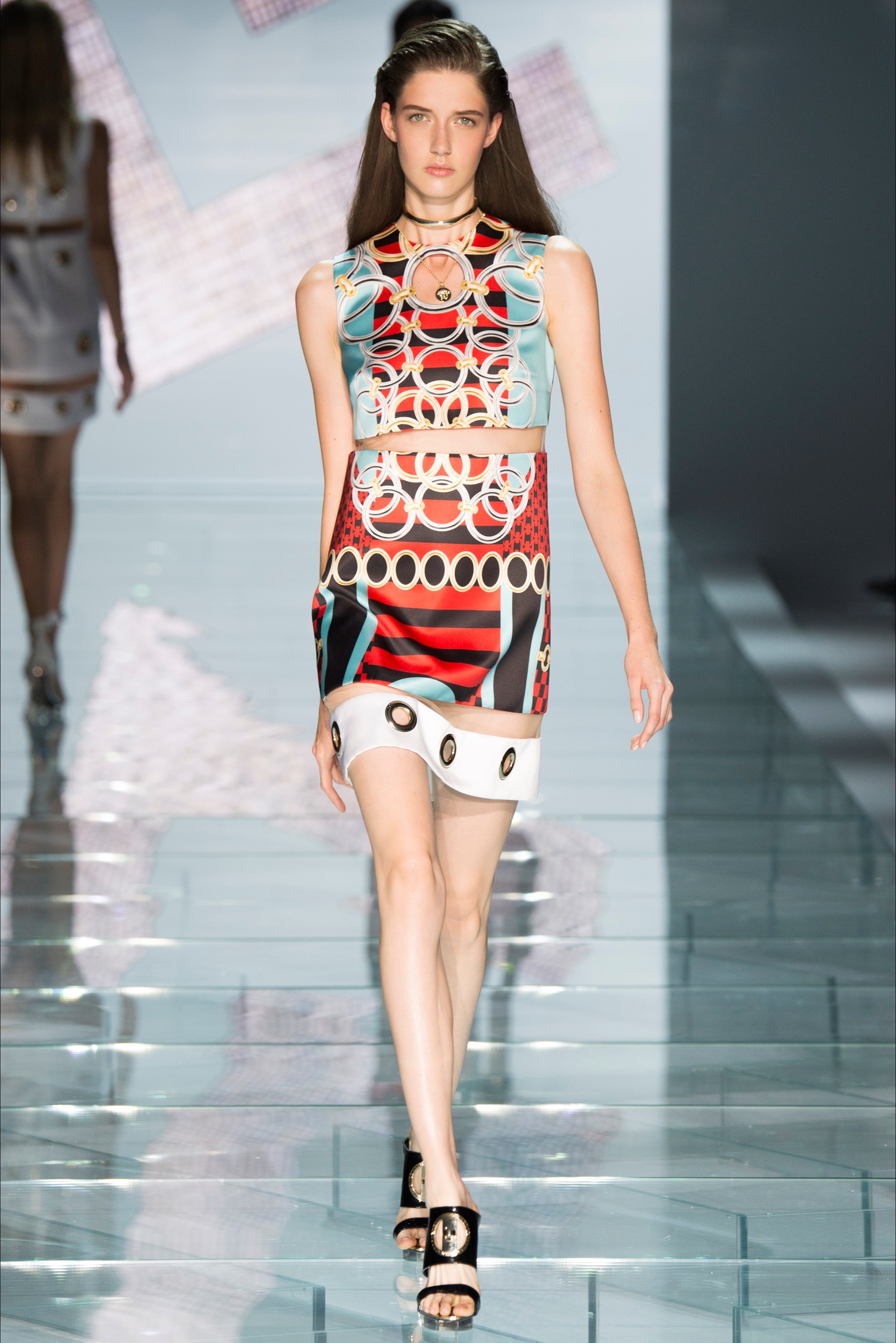 Предлагаю проследить как постепенно развивается шоу форм и цвета в новой коллекции весна/лето 2015 от модного дома Versace на показе во время Недели моды в Милане. Показ открывается черный пиджак на одной пуговице со множеством декоративны строчек, которые подчеркивают линейный силуэт одежды; укороченный топ и юбка с глубоким боковым разрезом.