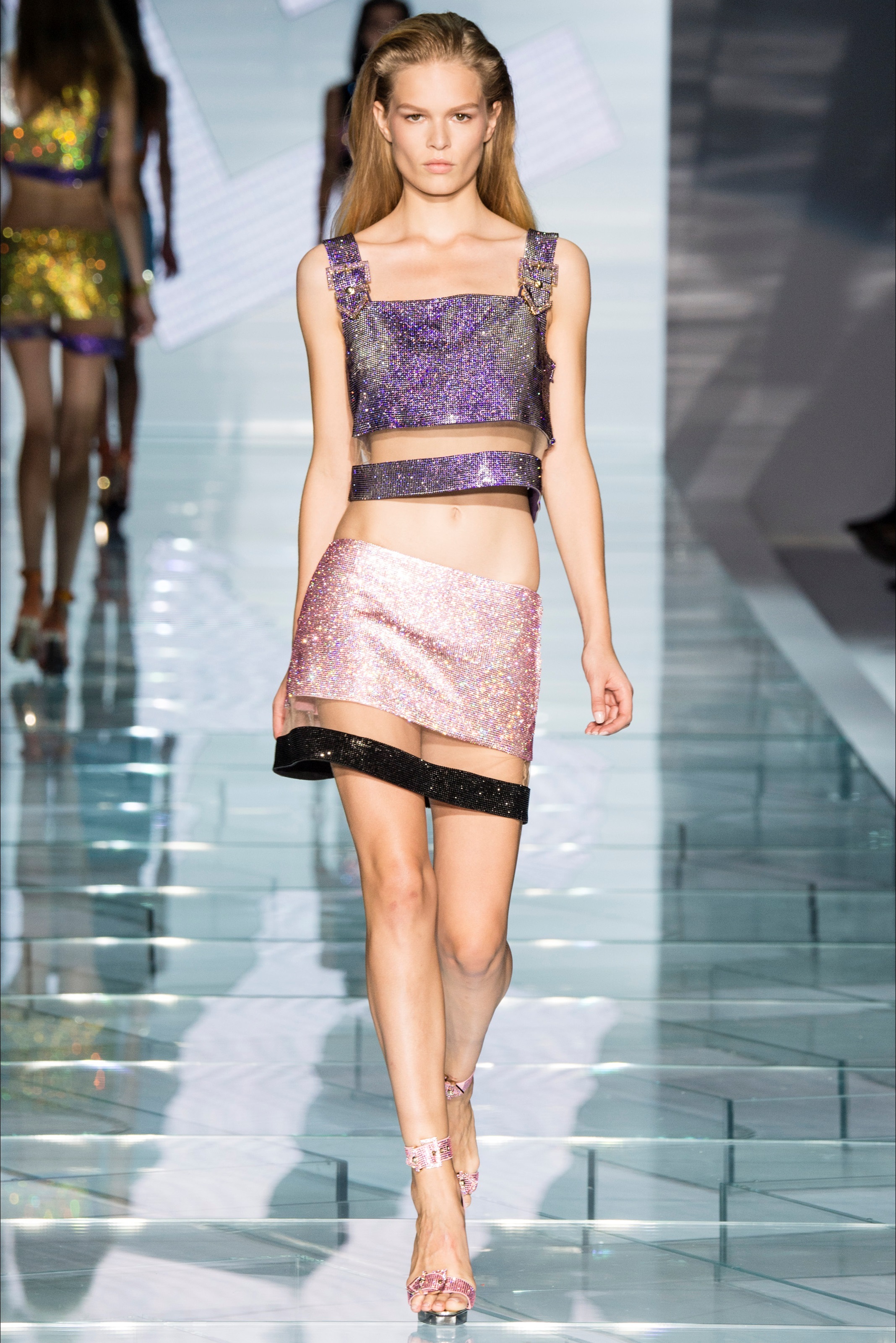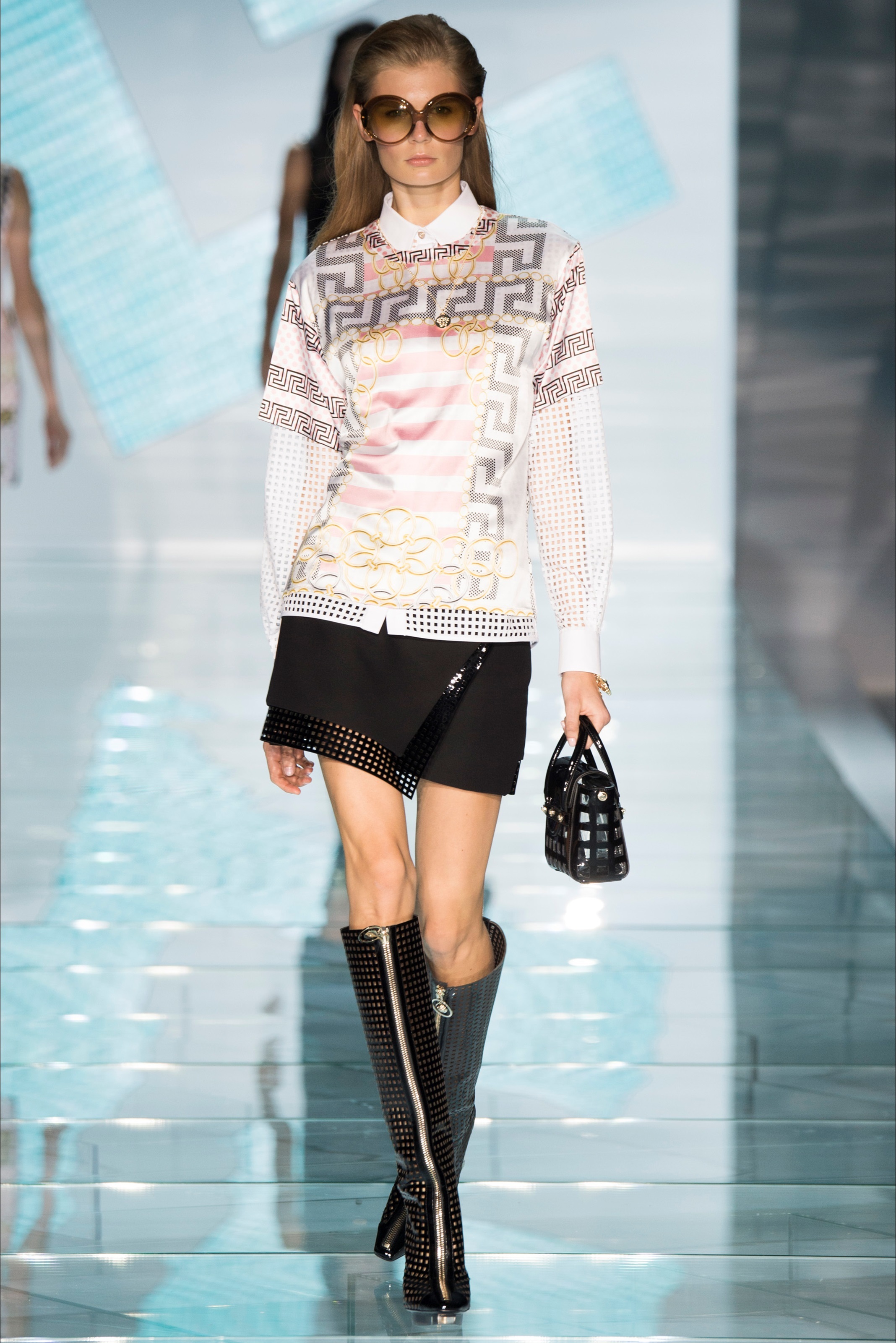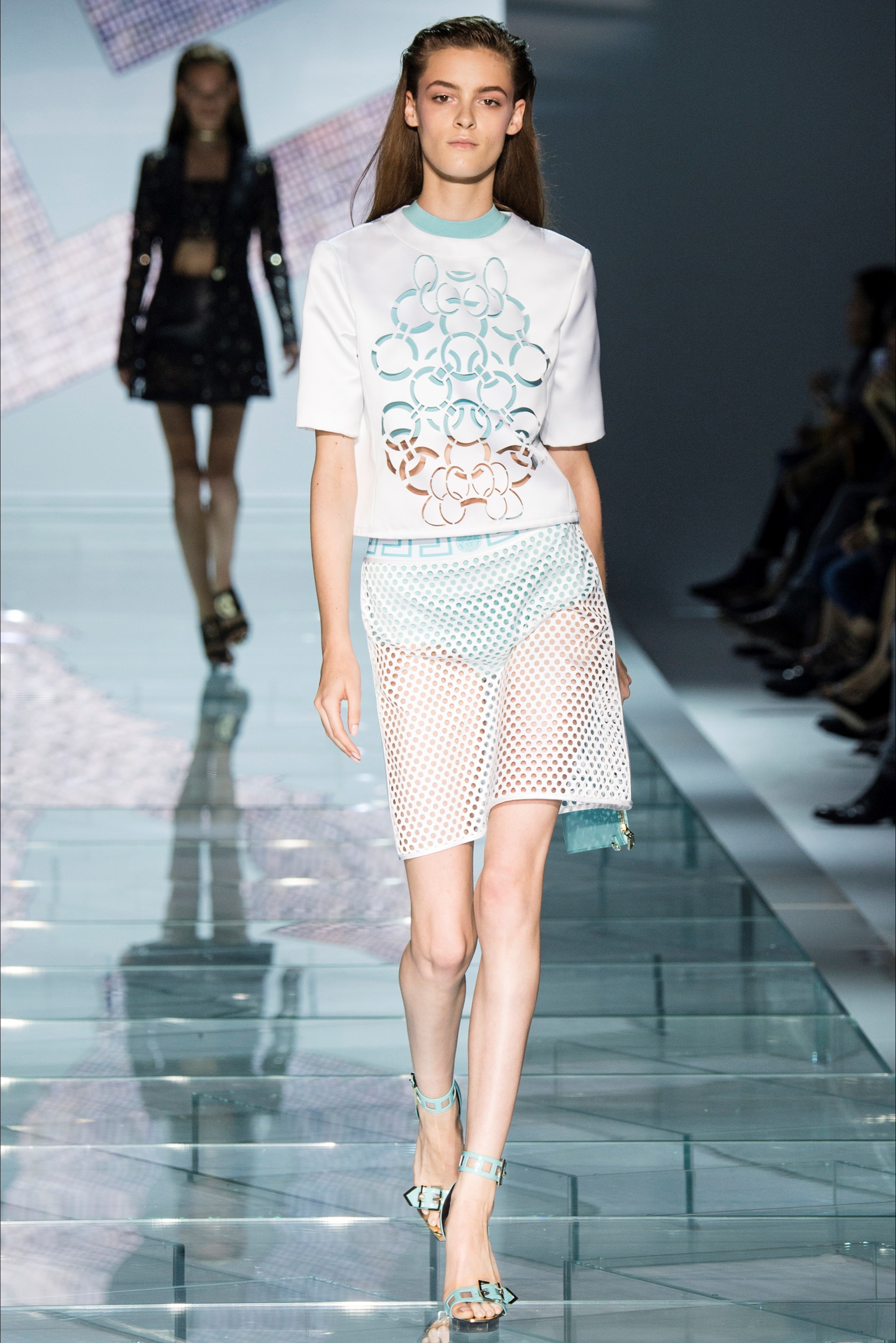 Затем идет смена цвета, сначала появляются нежно-розовые и голубые оттенки вместе со смелыми геометрическими узорами, напоминающими орнамент в греческом стиле модного дома. Затем орнамент начинает играть по-новому на платьях из черной ажурной кожи и сетки. Палитра становится все более яркой и вызывающей, чтобы взорваться в отсвечивающих бликах и мерцающих кристаллах на коктейльных платьях в финале. В коллекции прослеживается склонностью к асимметрии и доминирование мерцающих вставок на фоне обнаженной кожи.