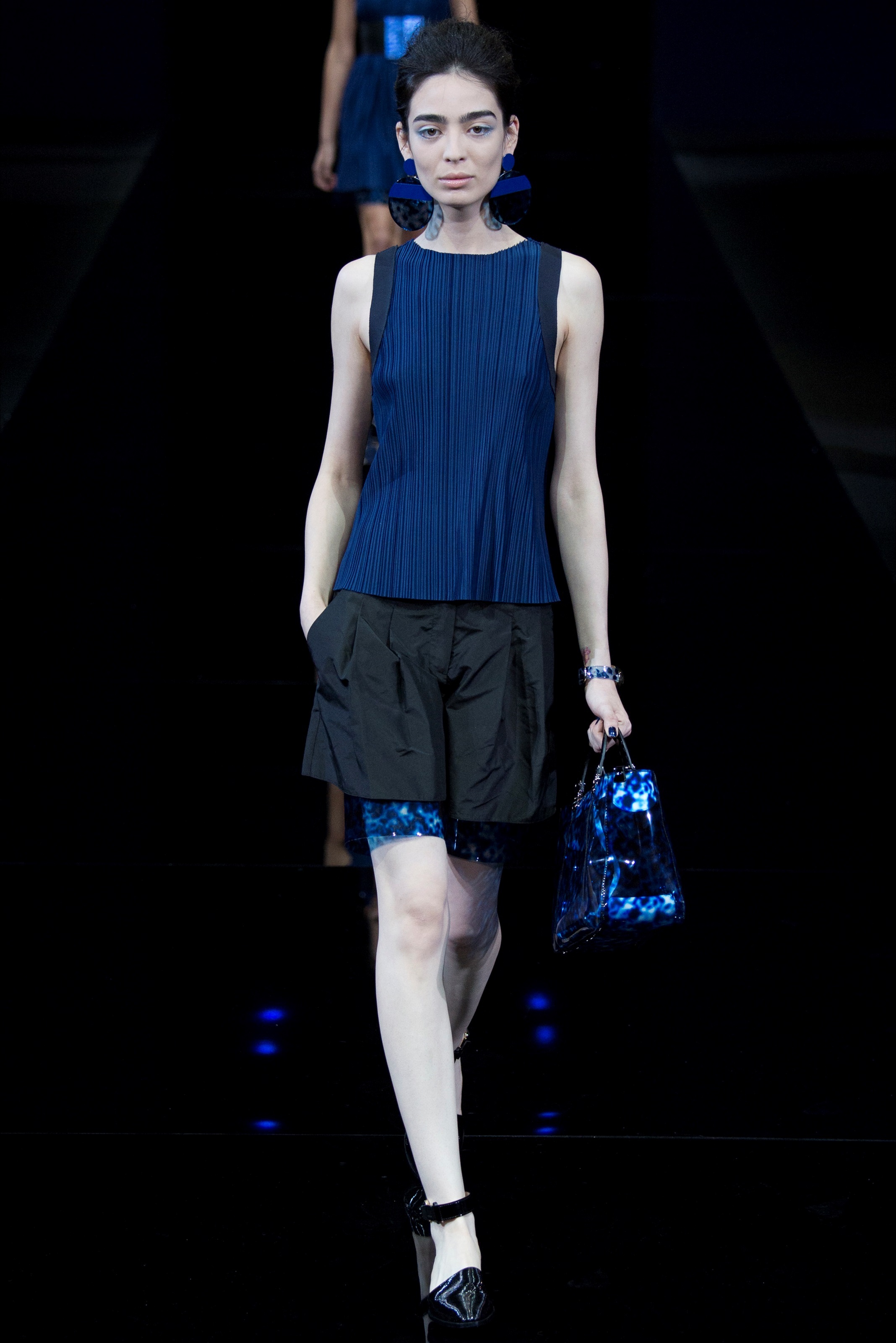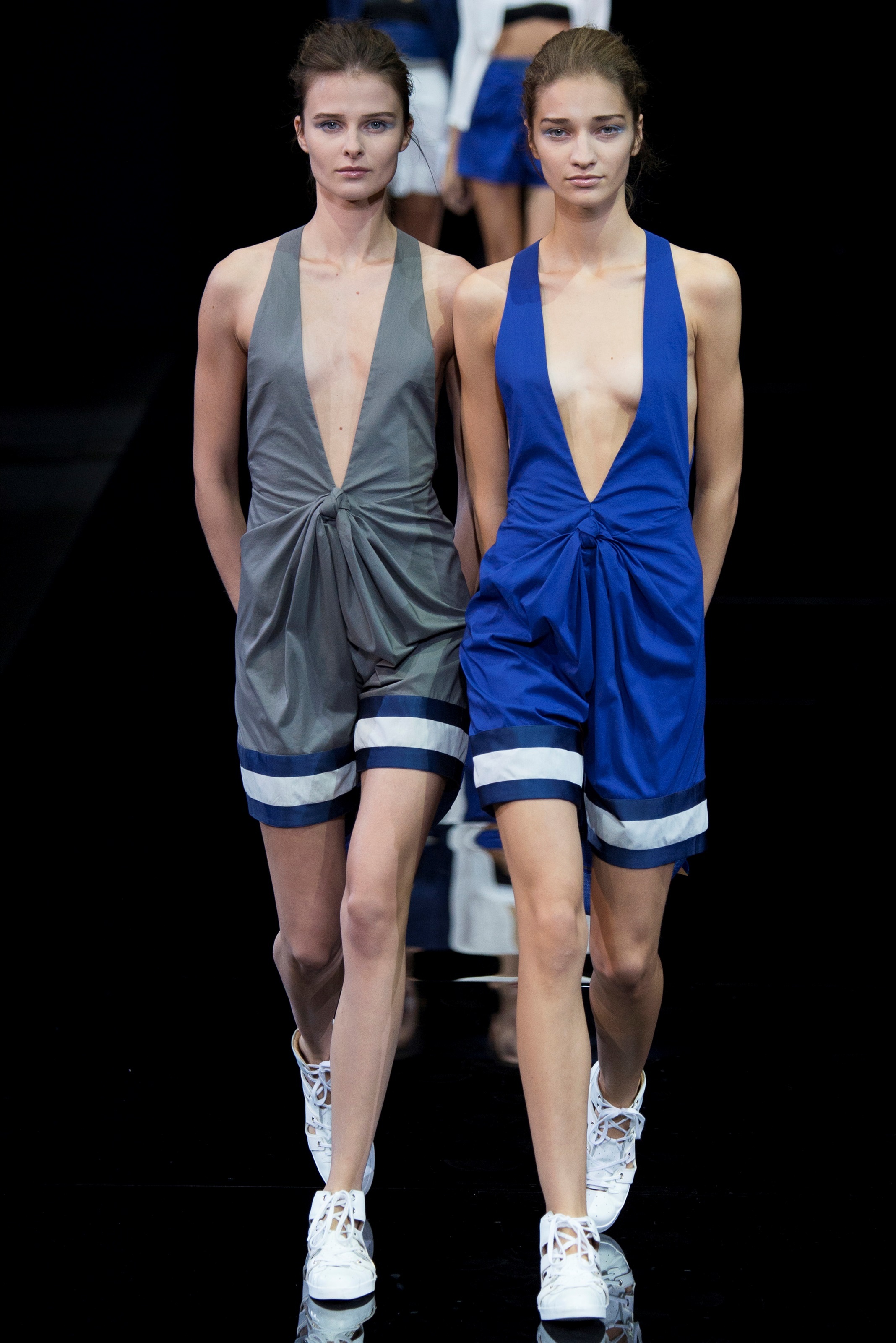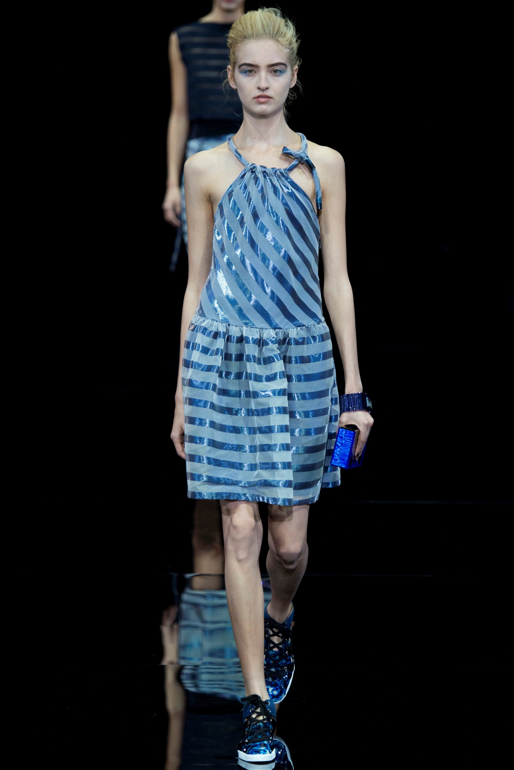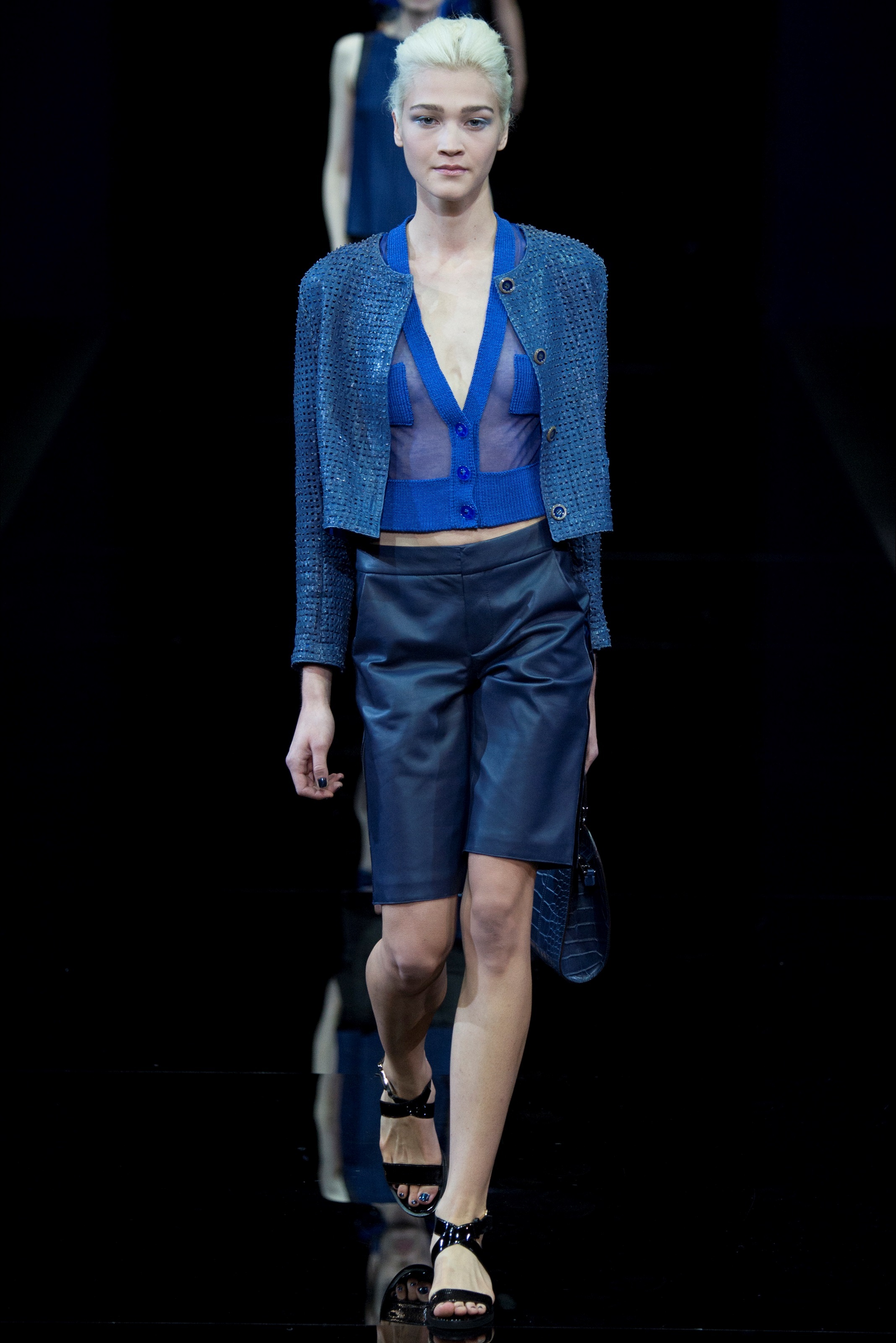 Джорджио Армани также думал о текстуре: выцветшие ситцевые платья, материалы с интенсивным блестящим напылением, полупрозрачные юбки с ПВХ покрытием и выглядывающие из-под них удлиненные шорты - это сочетание в стиле блюз было немного принудительным, но в общем коллекция получилась многогранной, и легко соединила в себе красоту и спорт.