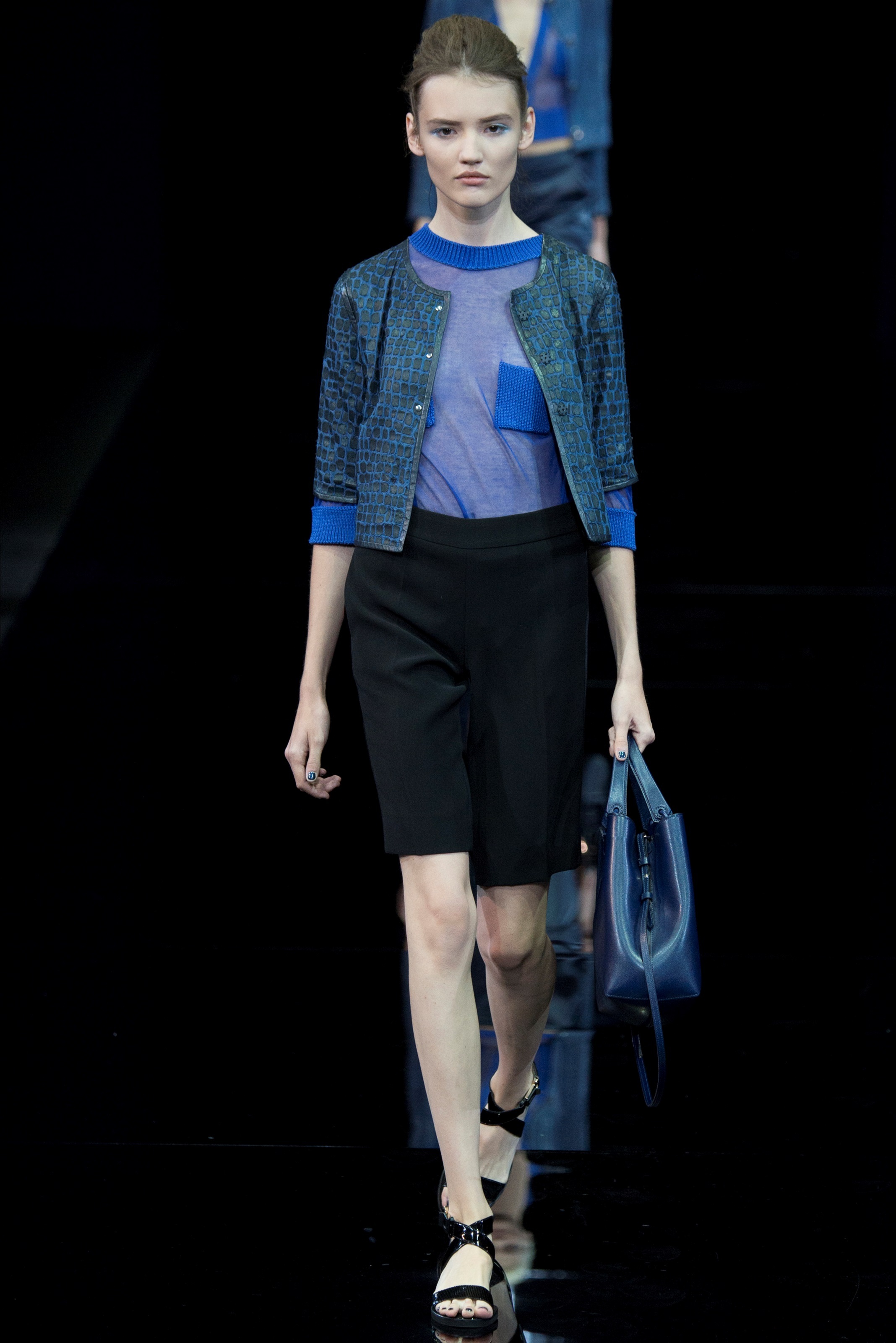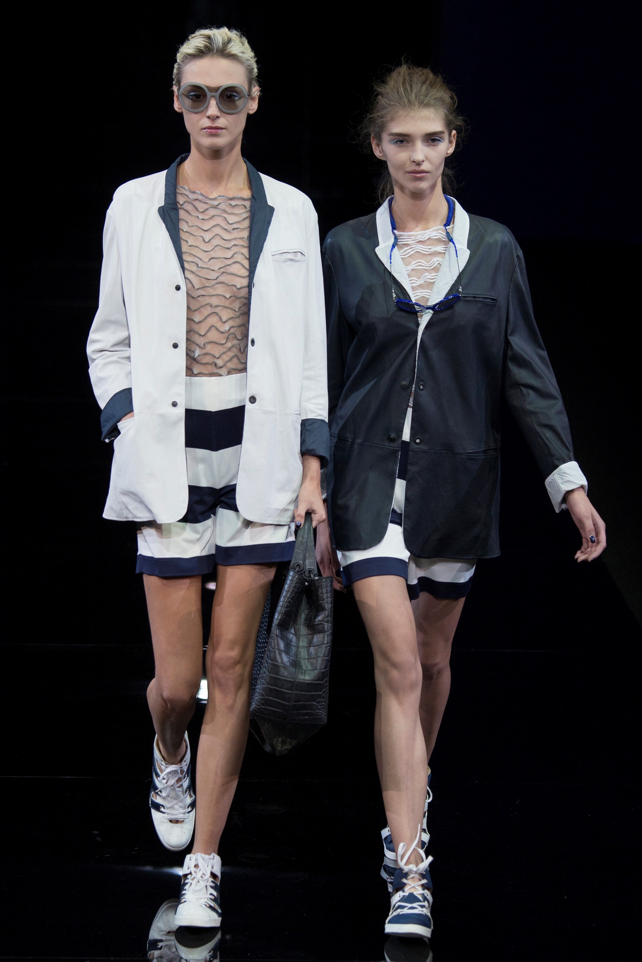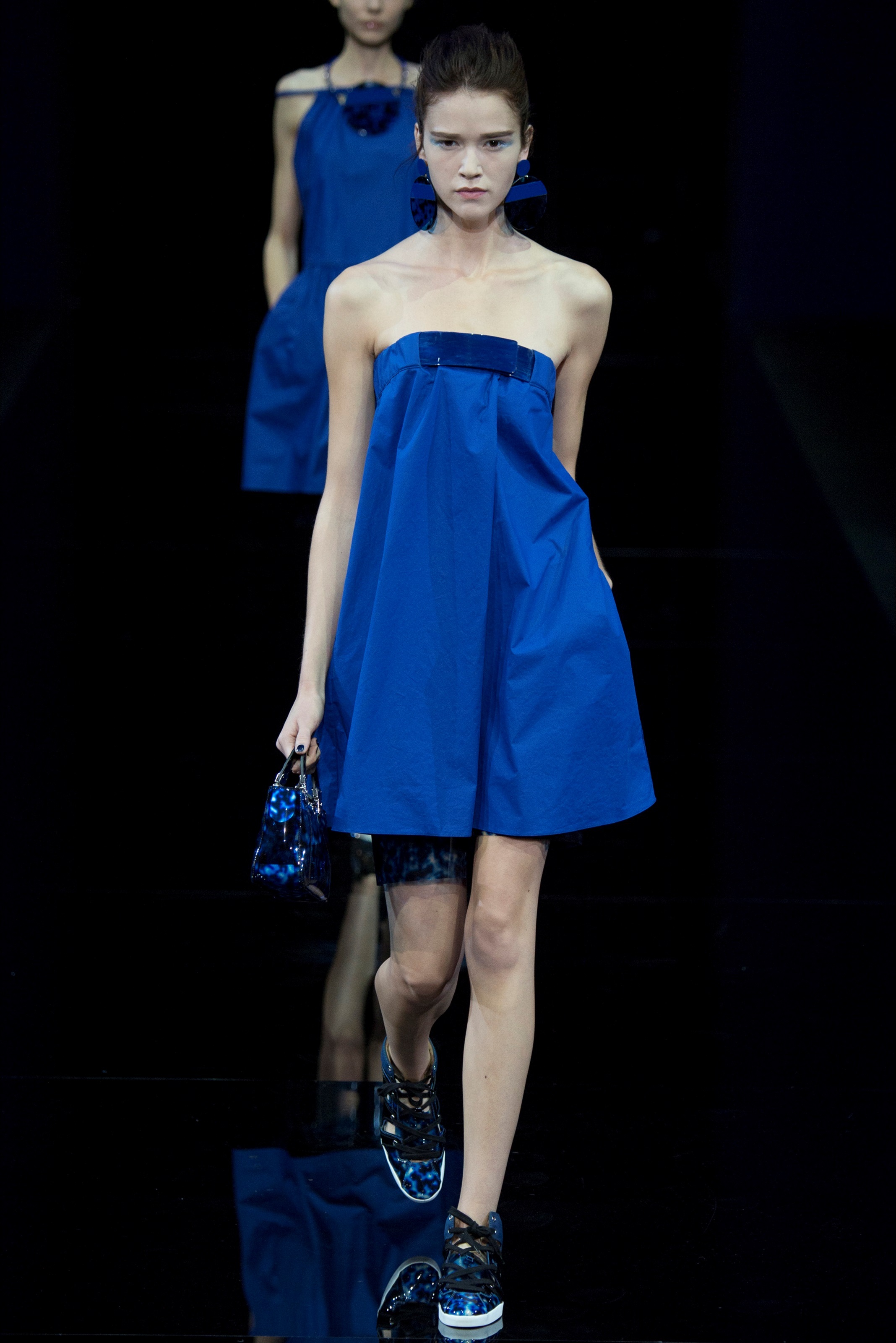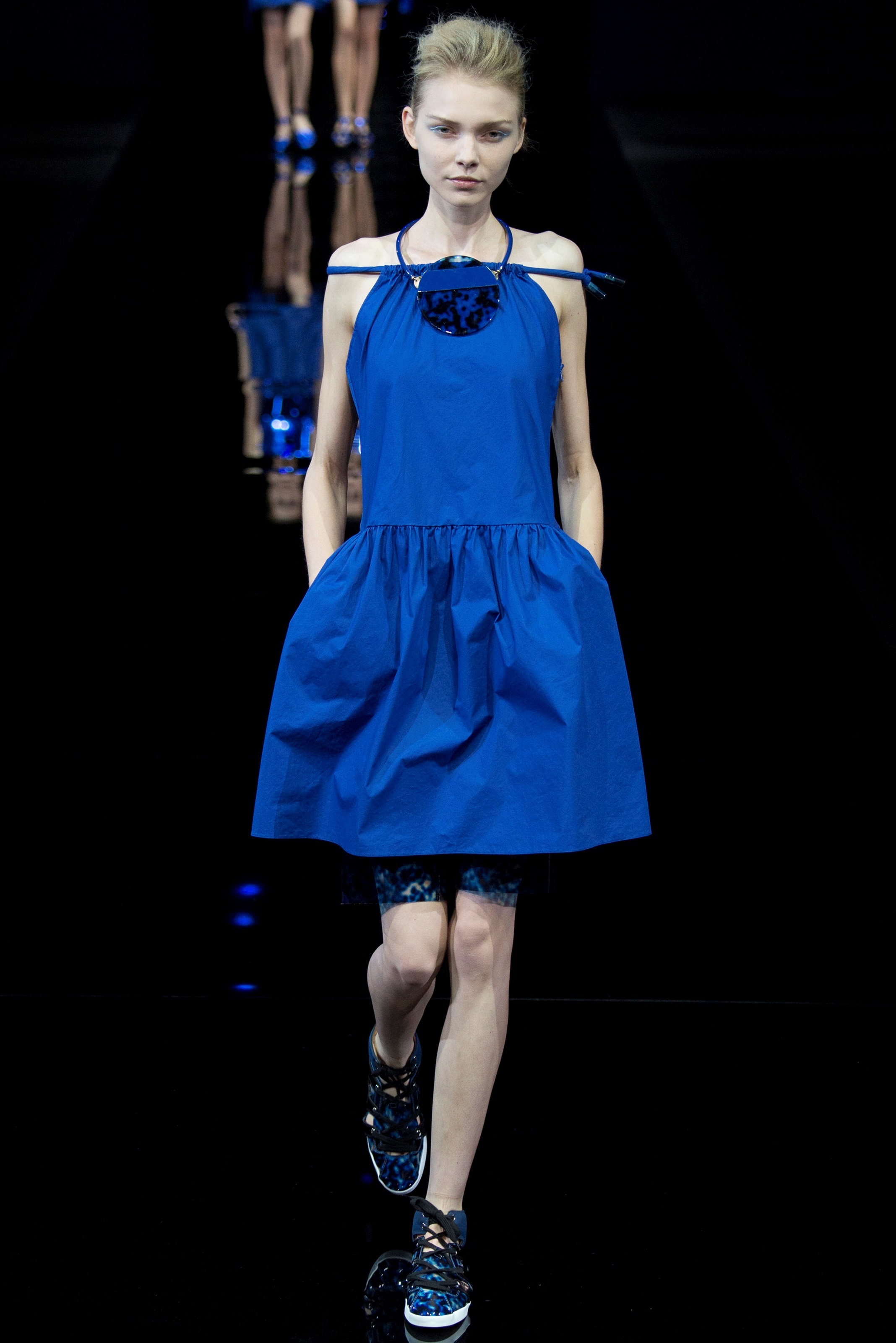 Джорджио Армани также думал о текстуре: выцветшие ситцевые платья, материалы с интенсивным блестящим напылением, полупрозрачные юбки с ПВХ покрытием и выглядывающие из-под них удлиненные шорты - это сочетание в стиле блюз было немного принудительным, но в общем коллекция получилась многогранной, и легко соединила в себе красоту и спорт.