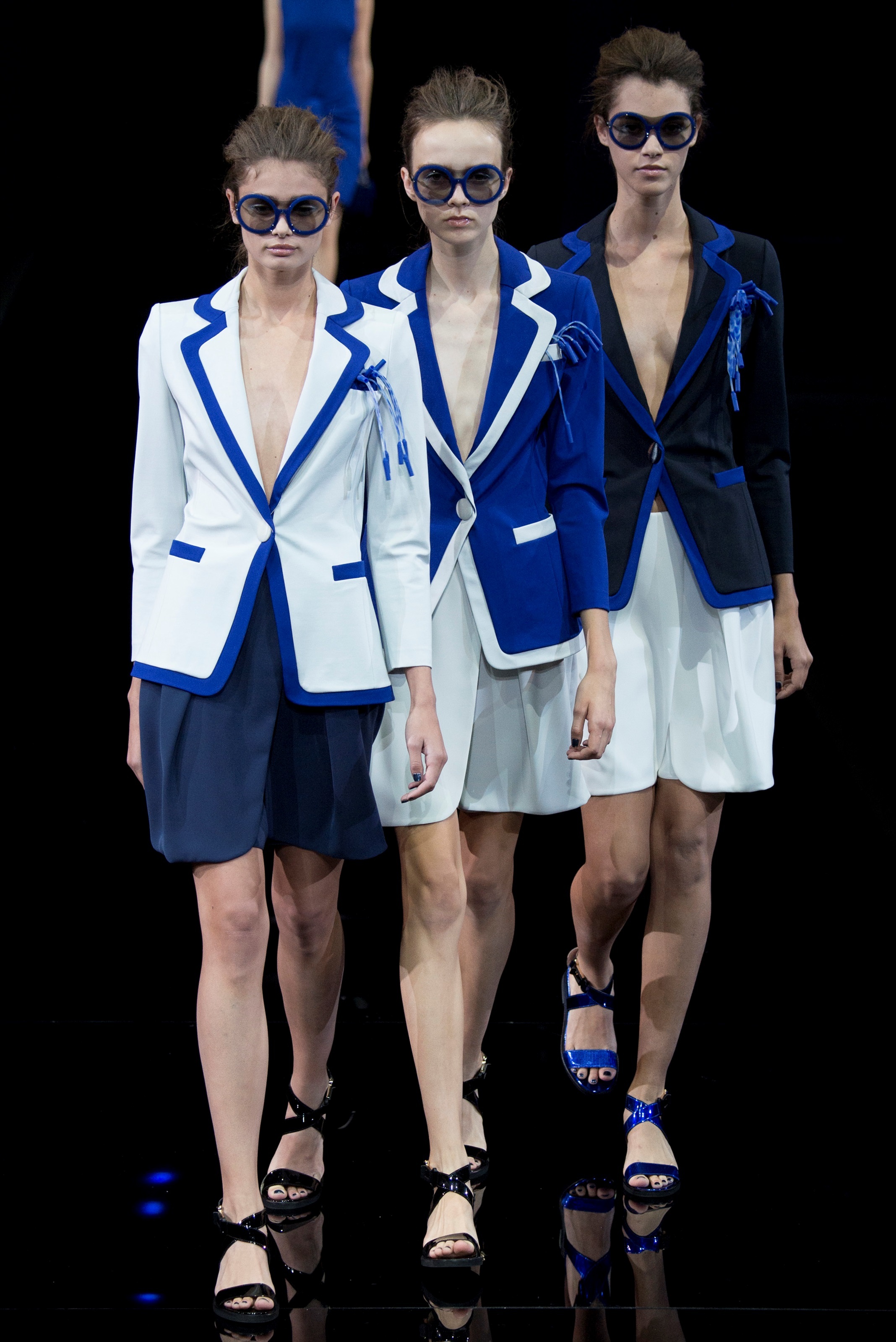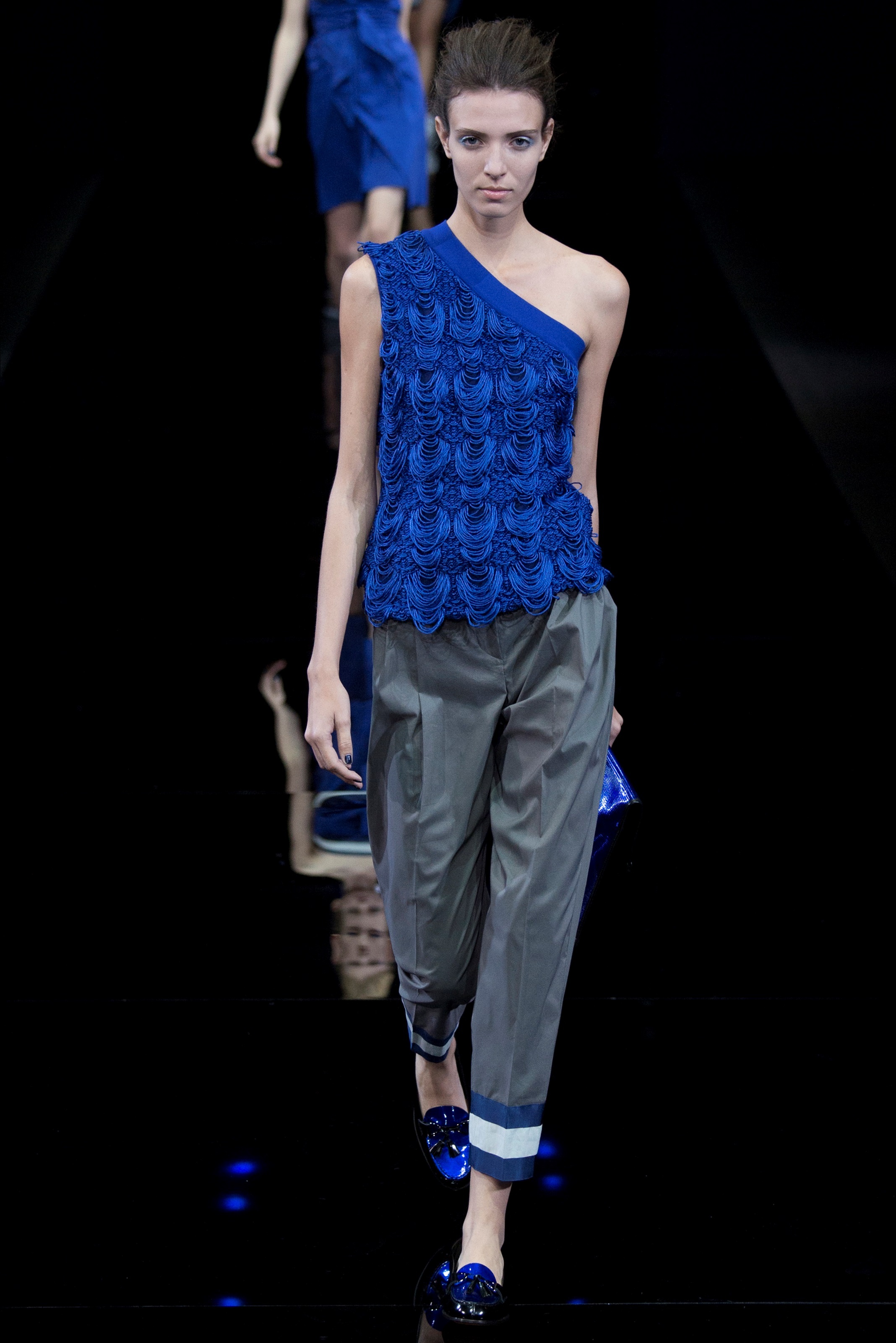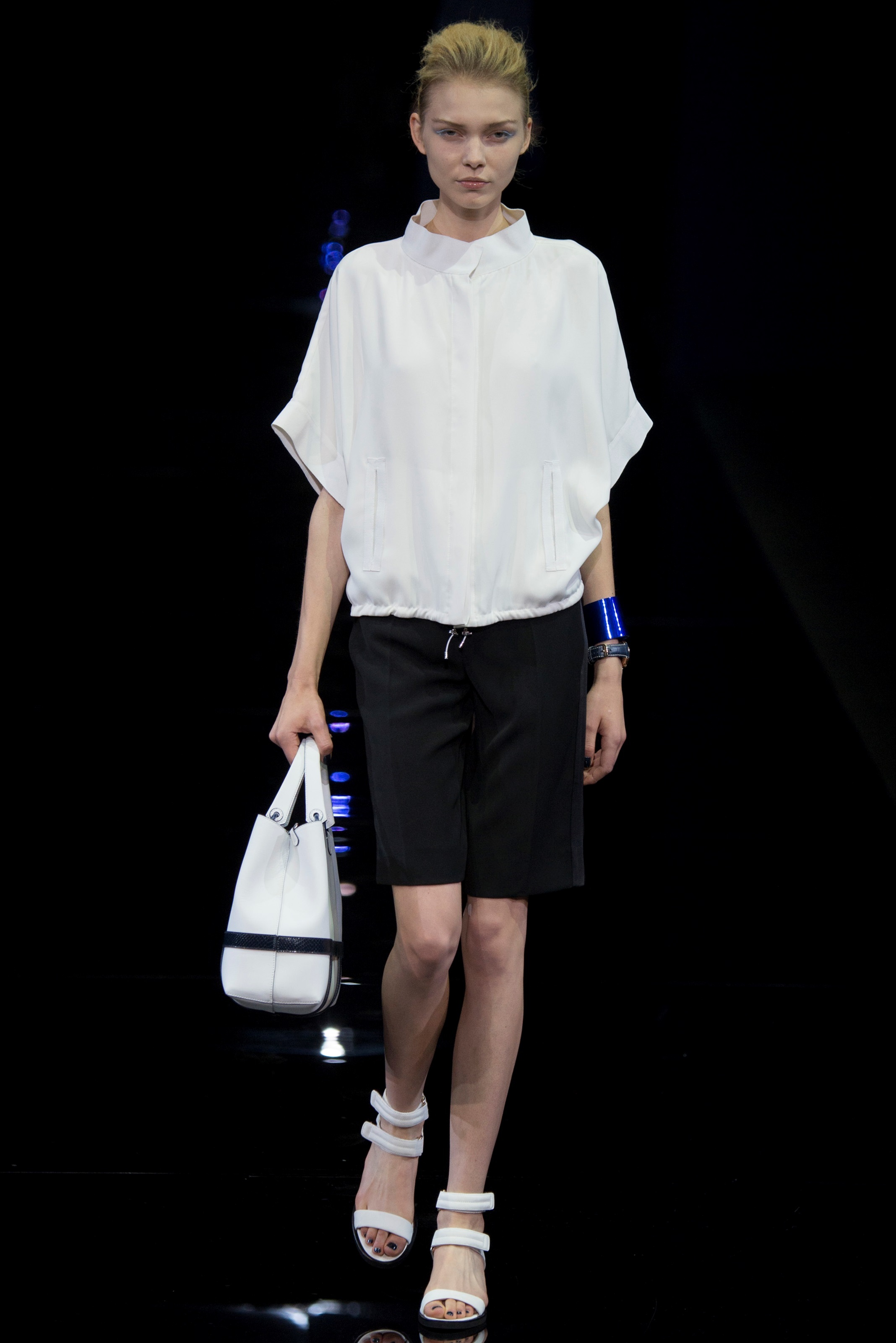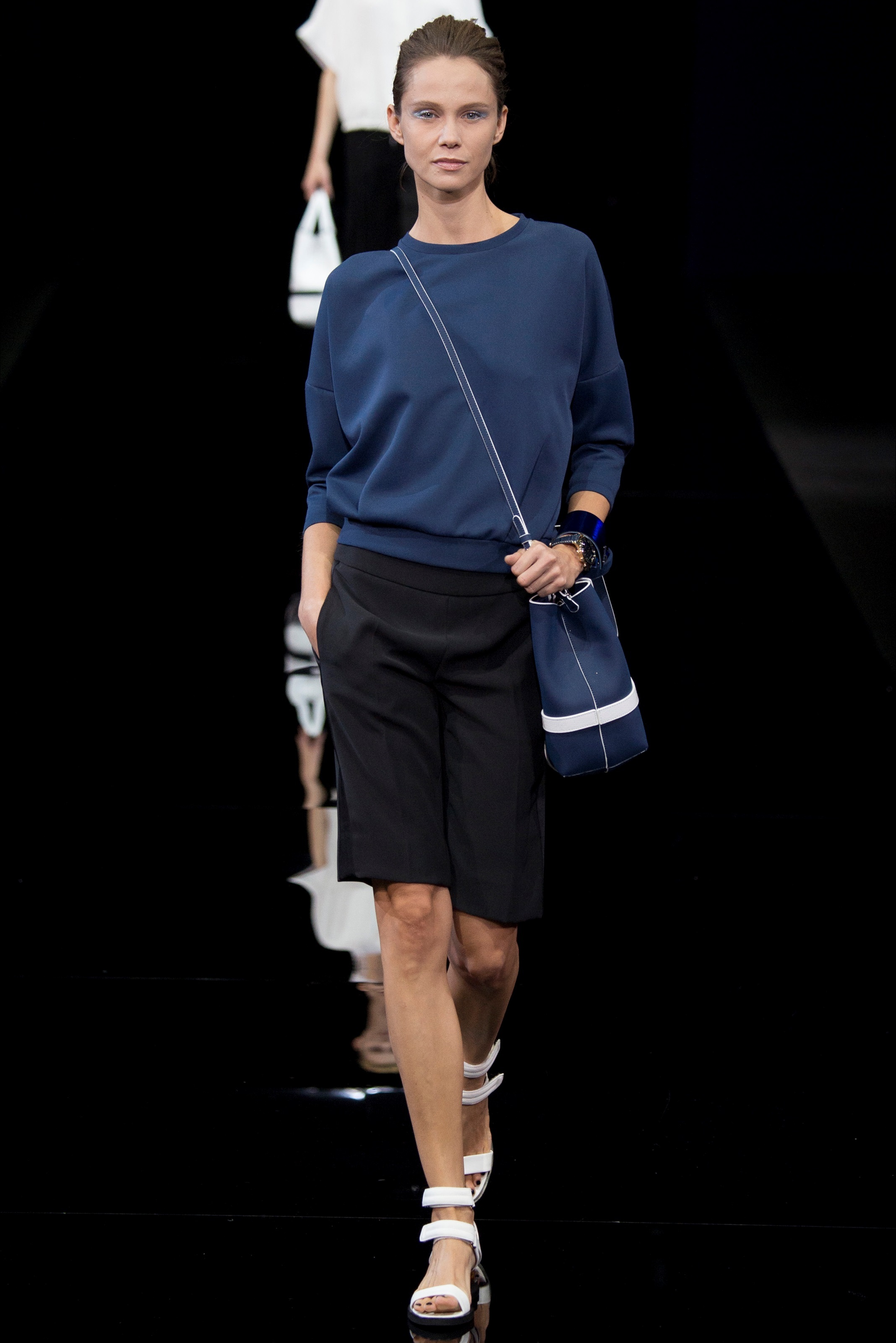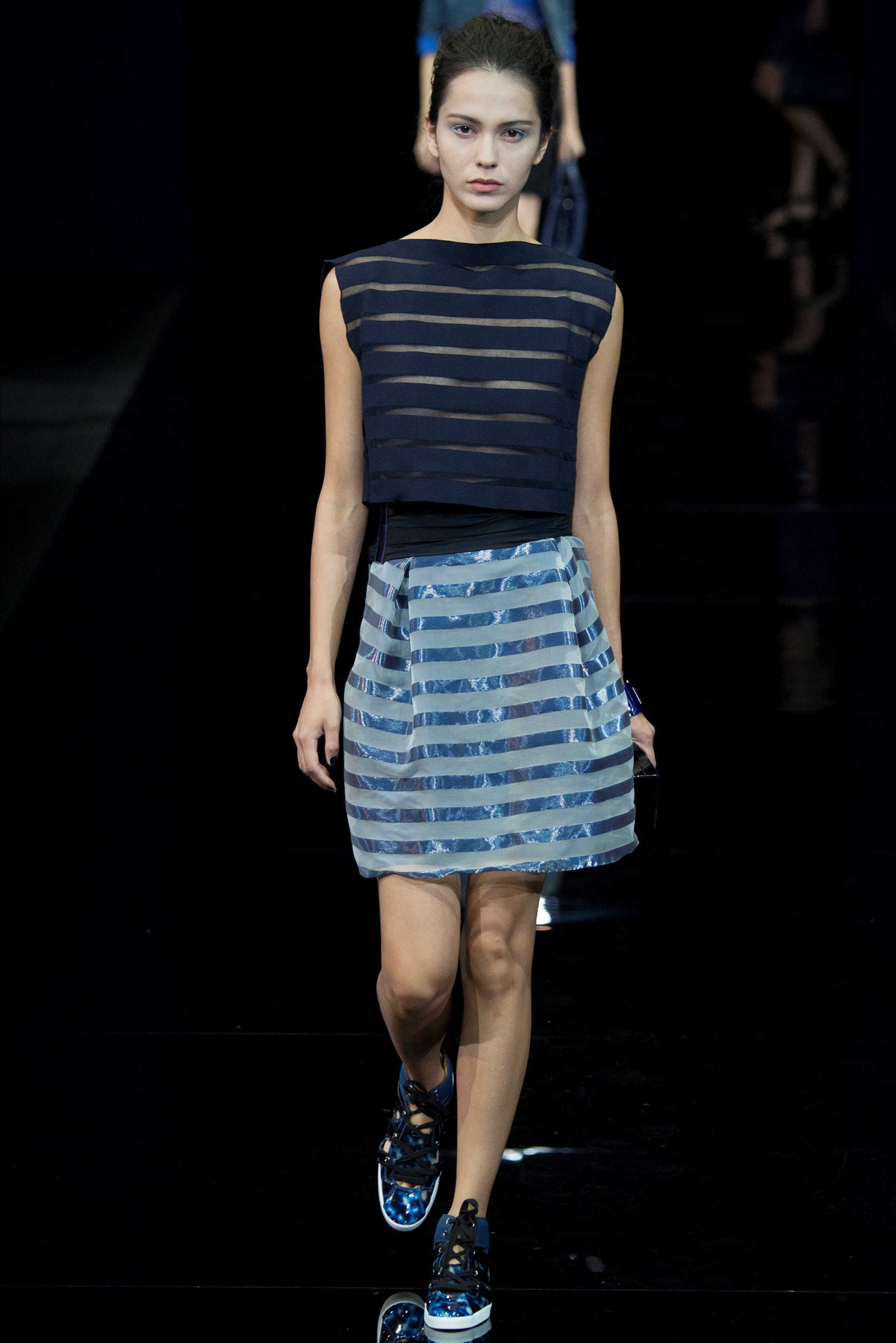 Джорджио Армани также думал о текстуре: выцветшие ситцевые платья, материалы с интенсивным блестящим напылением, полупрозрачные юбки с ПВХ покрытием и выглядывающие из-под них удлиненные шорты - это сочетание в стиле блюз было немного принудительным, но в общем коллекция получилась многогранной, и легко соединила в себе красоту и спорт.