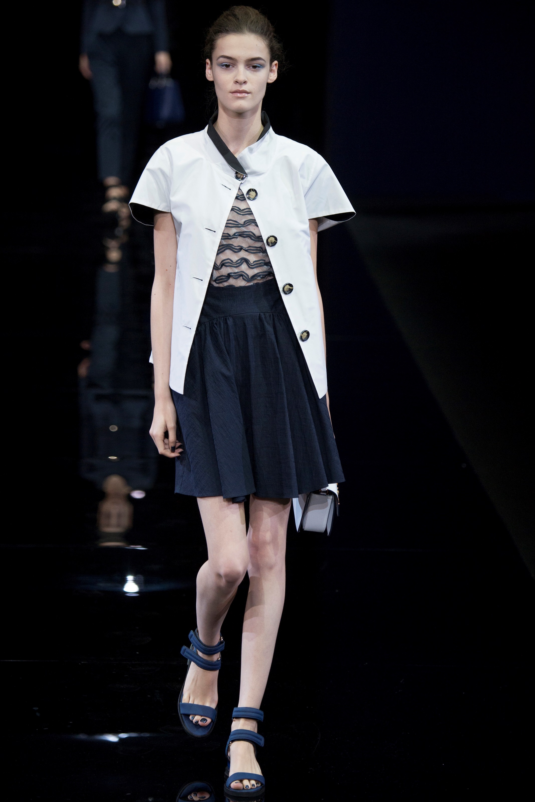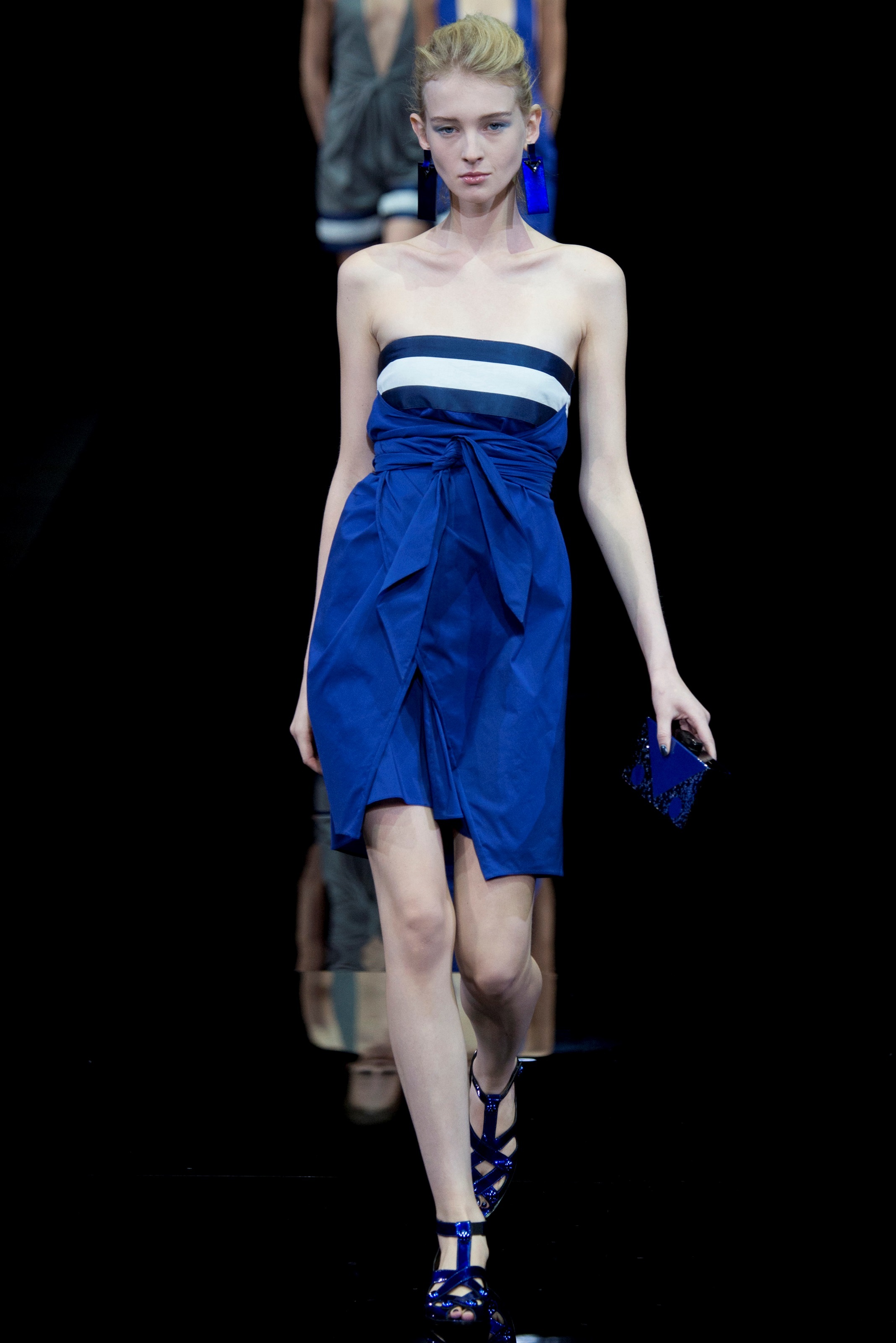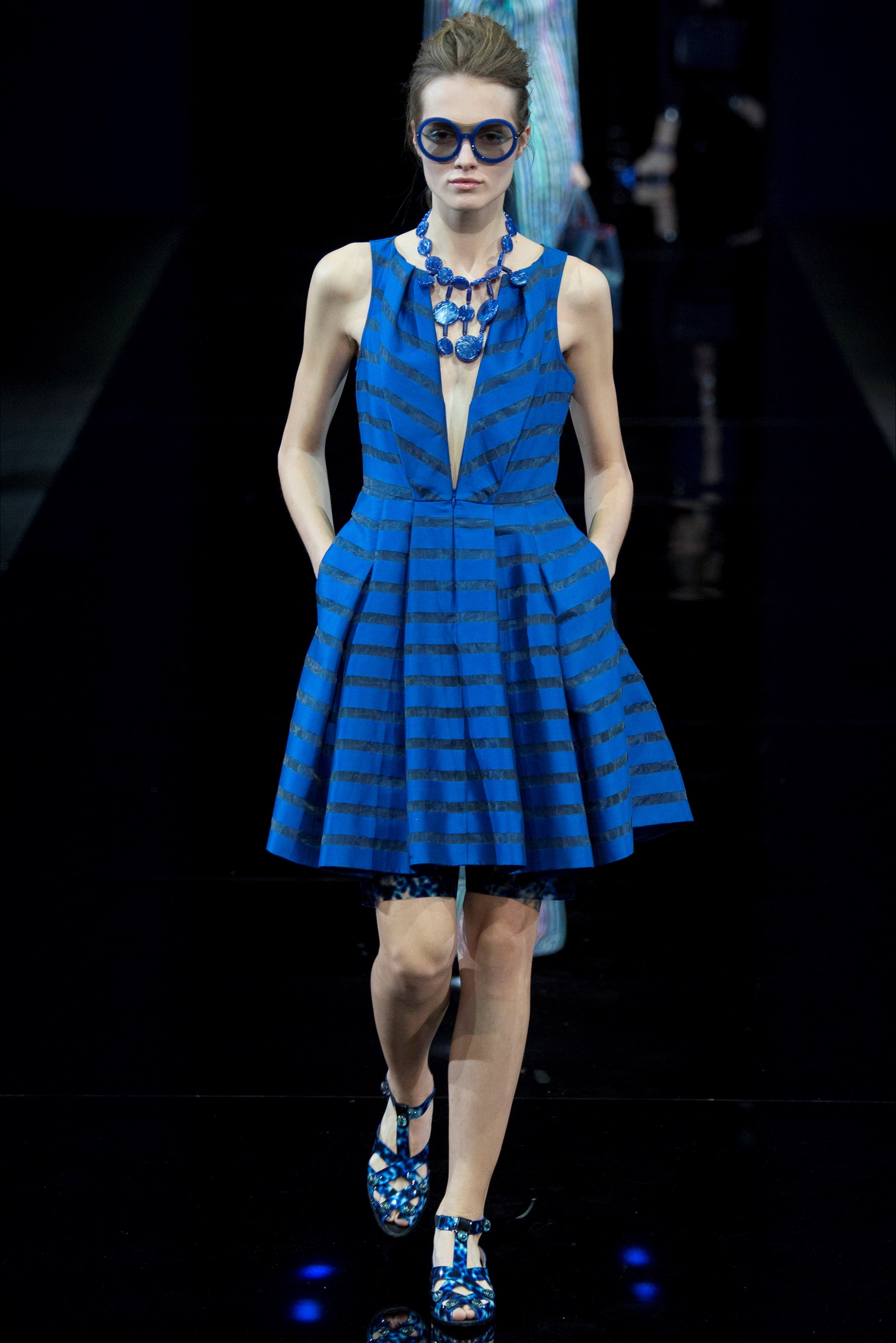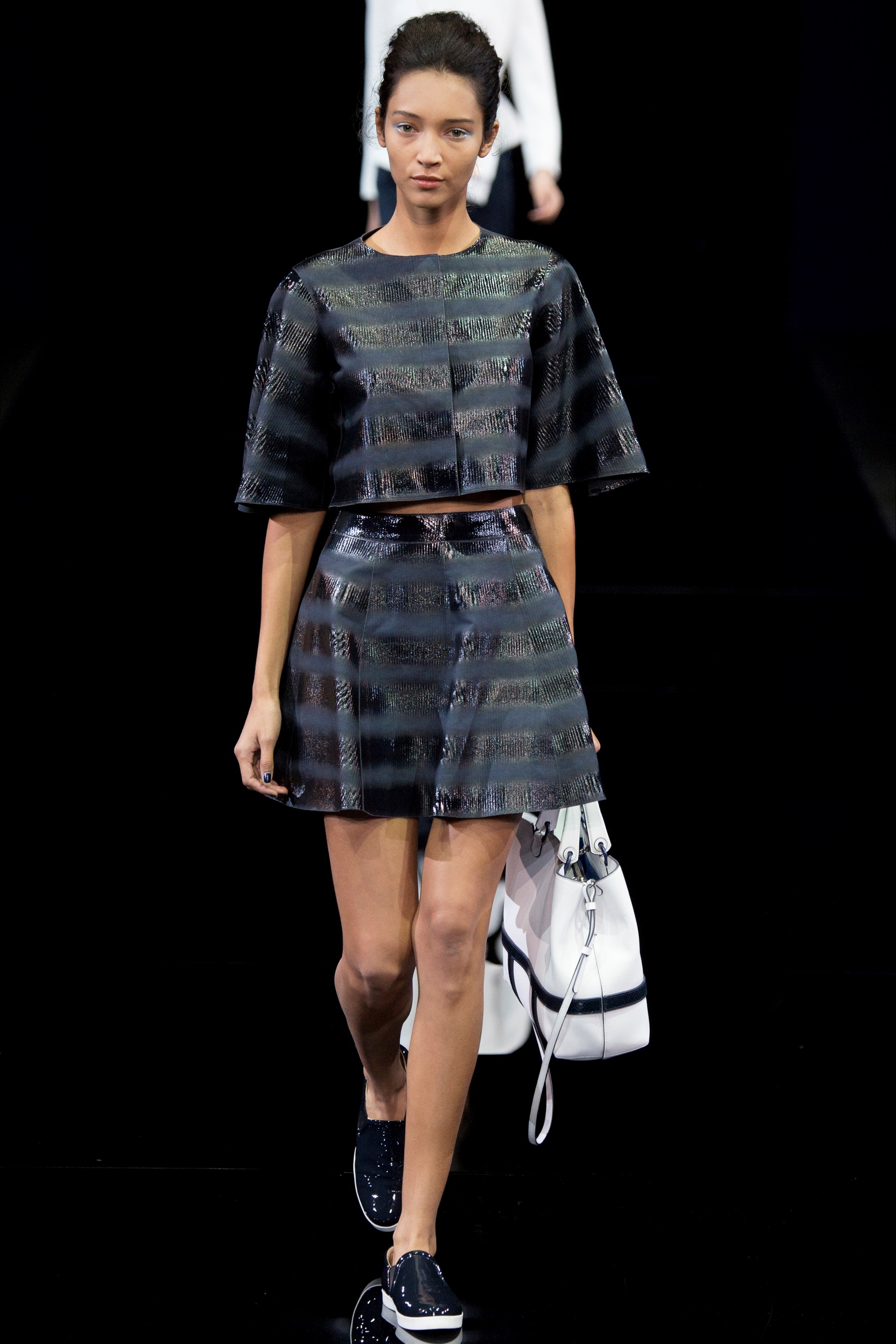 Джорджио Армани также думал о текстуре: выцветшие ситцевые платья, материалы с интенсивным блестящим напылением, полупрозрачные юбки с ПВХ покрытием и выглядывающие из-под них удлиненные шорты - это сочетание в стиле блюз было немного принудительным, но в общем коллекция получилась многогранной, и легко соединила в себе красоту и спорт.