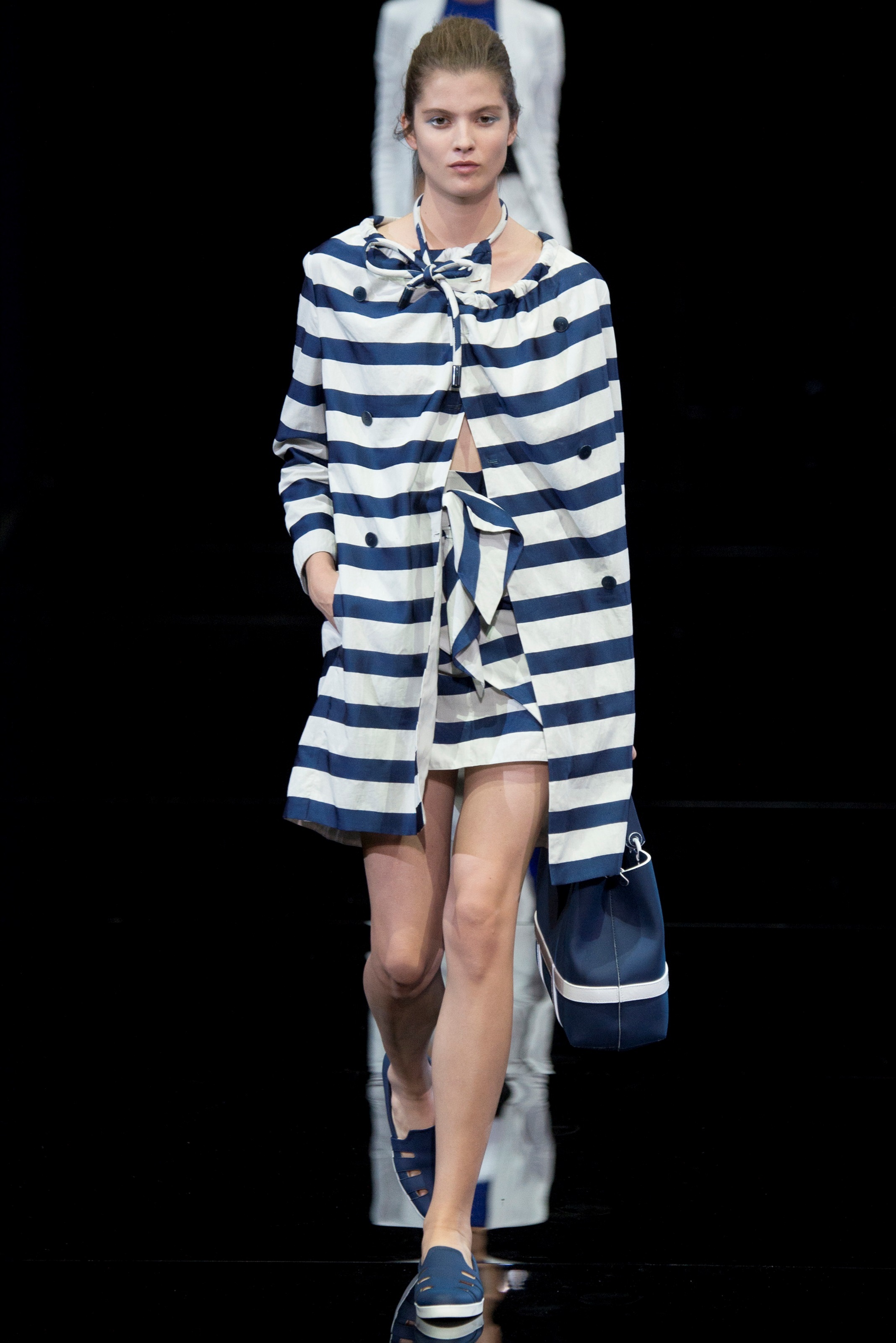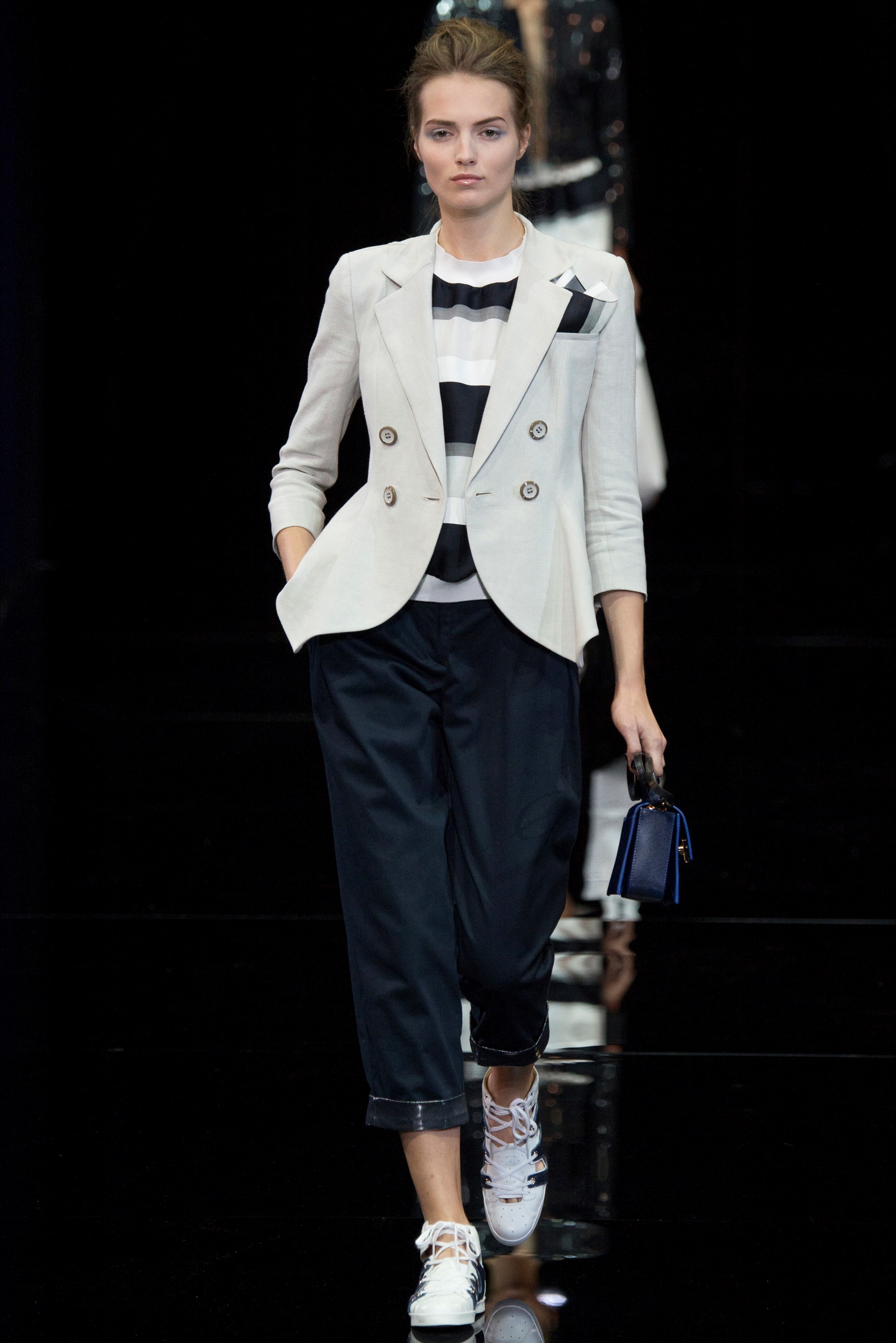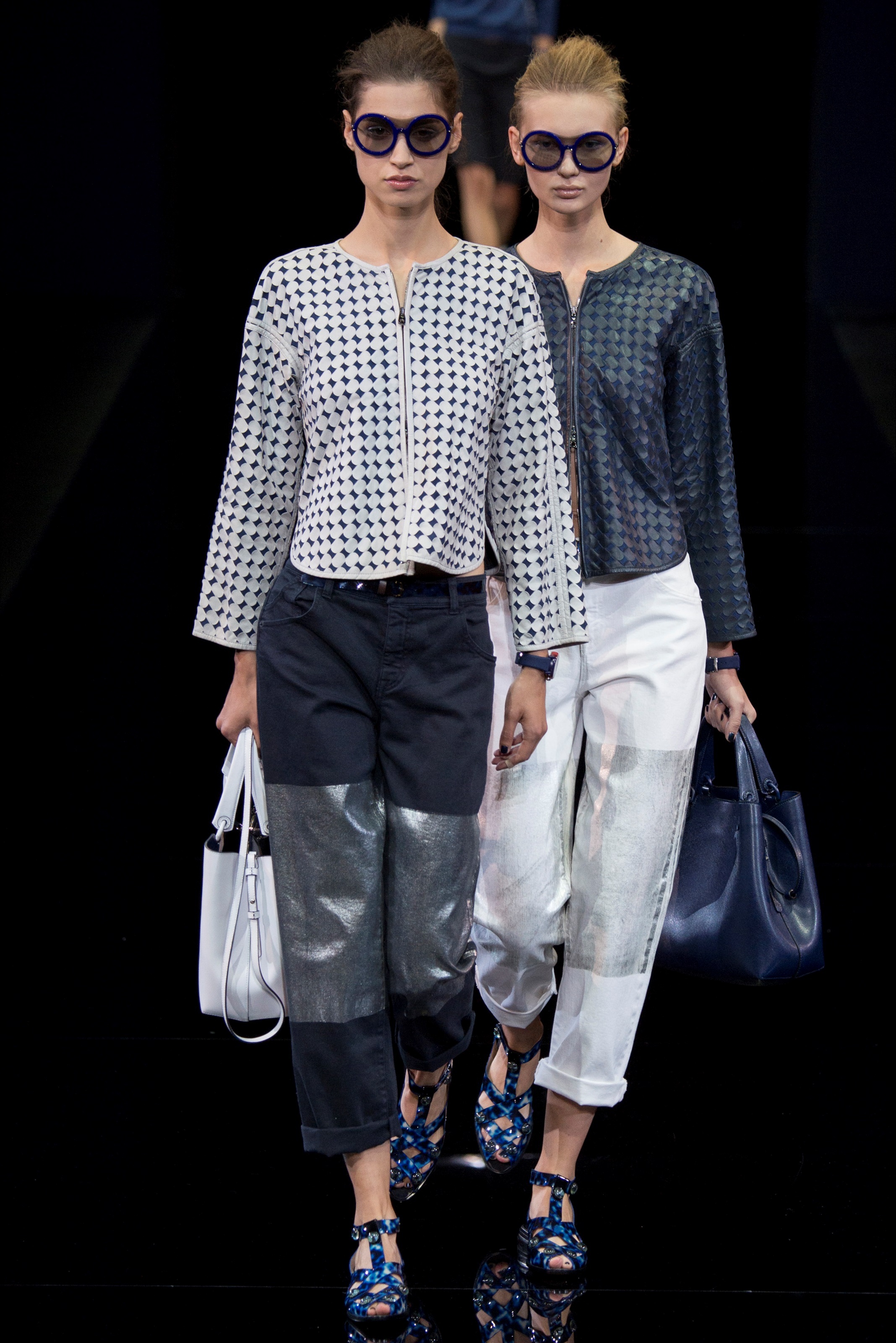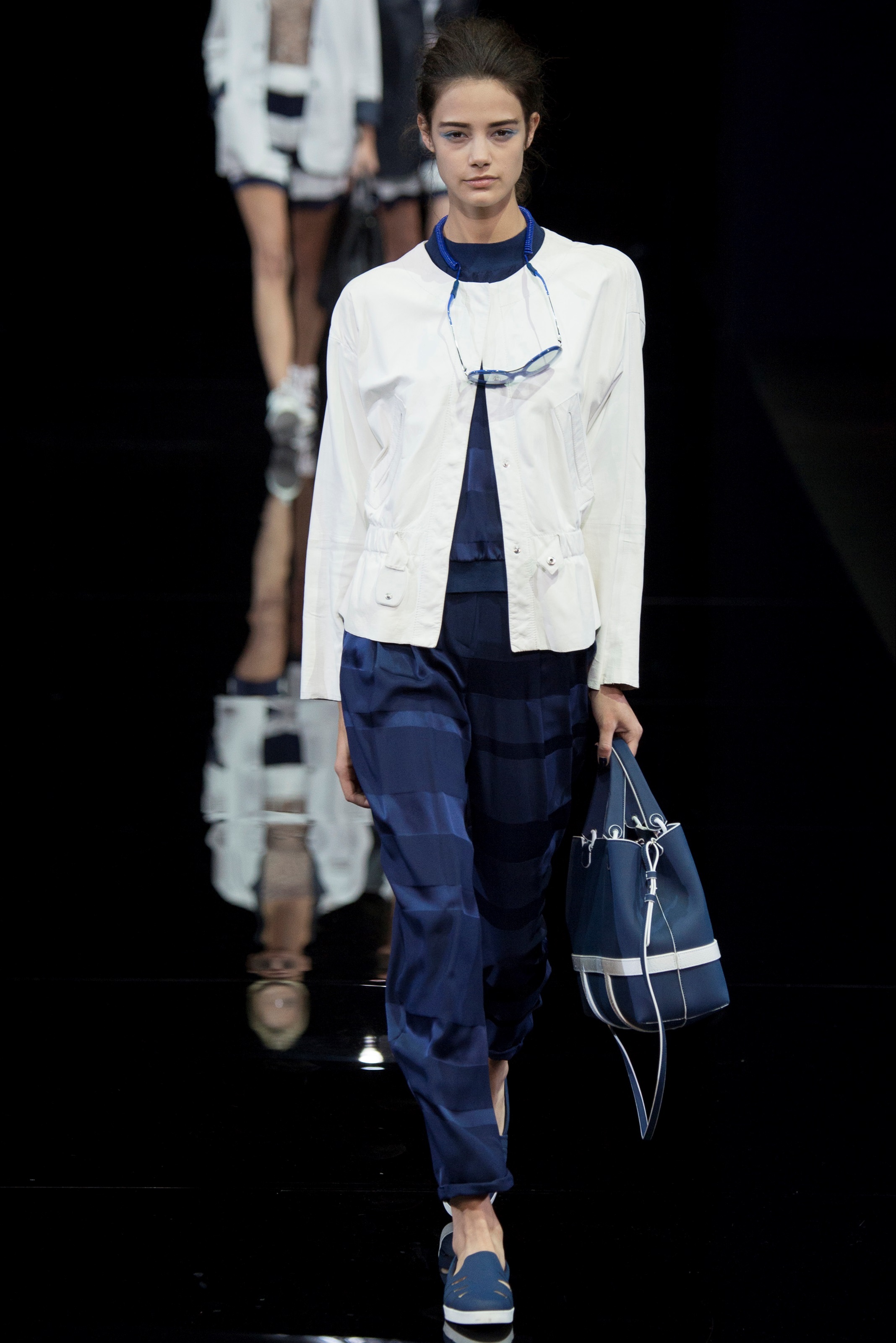Джорджио Армани также думал о текстуре: выцветшие ситцевые платья, материалы с интенсивным блестящим напылением, полупрозрачные юбки с ПВХ покрытием и выглядывающие из-под них удлиненные шорты - это сочетание в стиле блюз было немного принудительным, но в общем коллекция получилась многогранной, и легко соединила в себе красоту и спорт.