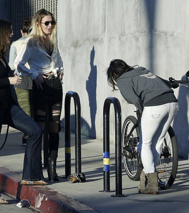 36-летняя актриса каталась на велосипеде по Венис-Бич, когда была узнана компанией гуляющих людей. Когда те с ней поздоровались, она остановилась рядом с ними и уделила особое внимание одной из девушек. Она с энтузиазмом стала рассказывать ей об электрическом велосипеде и даже предложила на нем прокатиться, но та, засмущавшись, отказалась. После чего актриса, попрощавшись, уехала.
