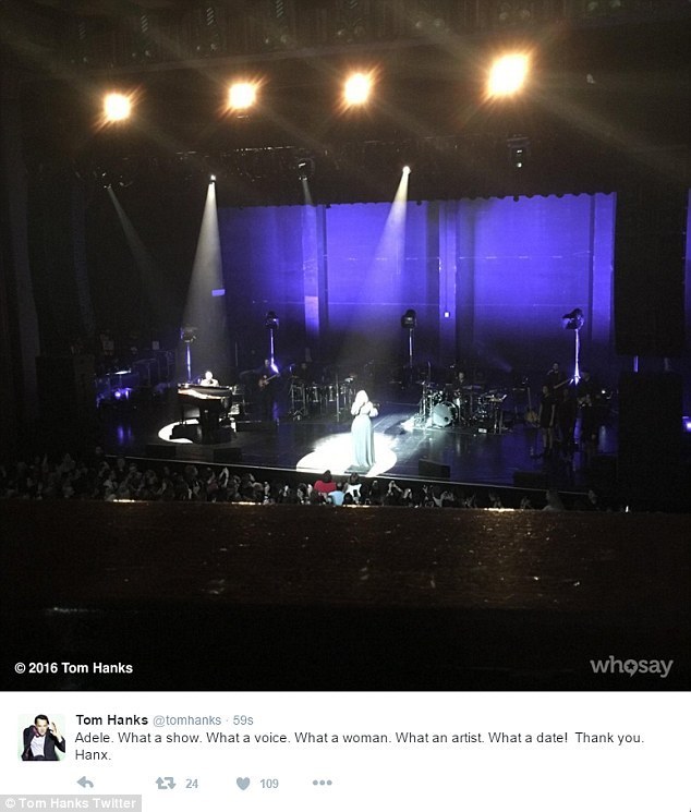 Также на шоу Адель присутствовал Том Хэнкс, который после написал в своем твиттере: "Какое шоу. Какой голос. Ах, какая женщина. Что за художник. Какой день. Спасибо. Хэнкс".