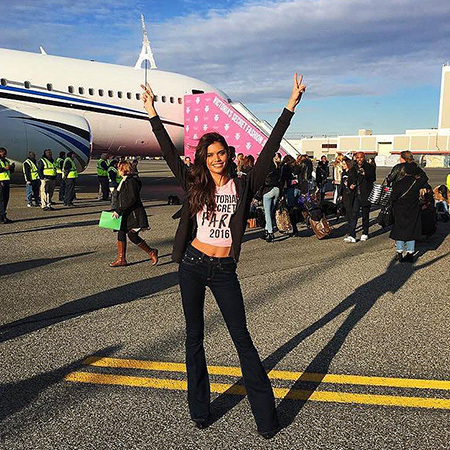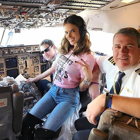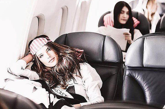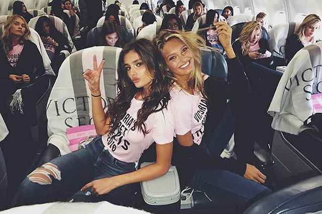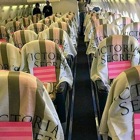 Модели устроили яркую фотосессию прямо в аэропорту и на борту частного самолета, украшенного в стиле Victoria`s Secret: розовый трап, полосатые подушки.