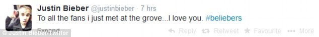 Позже он написал на твиттере: "Для всех своих болельщиков, которых я встретил в Grove. Я люблю вас #Beliebers ".