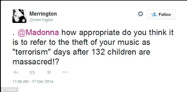 В принципе до сих слов ее обращение было вполне понятным и оправданным, однако потом поп-звезда начала сравнивать свой инцидент с терроризмом и художественным изнасилованием, чем вызвала целую бурю негодования среди интернет-пользователей. Они не понимают, как какая-то утечка музыки и фривольных фотографий может сравниться с человеческими жизнями, приводя примеры терроризма, которые прошли лишь на этой неделе. В частности резню в пакистанской школе, где погибло более 130 детей и захват заложников в Сиднее, где также есть человеческие жертвы.