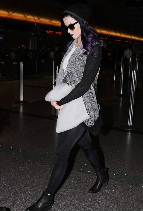 Кэти Перри похоже уже не слишком задумывается над своим макияжем. Когда певицу заметили в аэропорту Лос-Анджелеса вчера поздно вечером, ее макияж, однозначно, больше подходил для сцены, чем для авиаперелета.