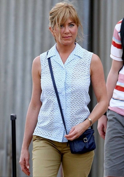 Дженнифер Энистон была замечена в Каролине на съемочной площадке фильма-комедии «Мы-Миллеры», где актриса играет проститутку. Пару 43-летней актрисе составляет ее частый партнер по съемкам Джейсон Судейкис. Актриса одета довольно простенько, что видимо соответствует образу ее героини.