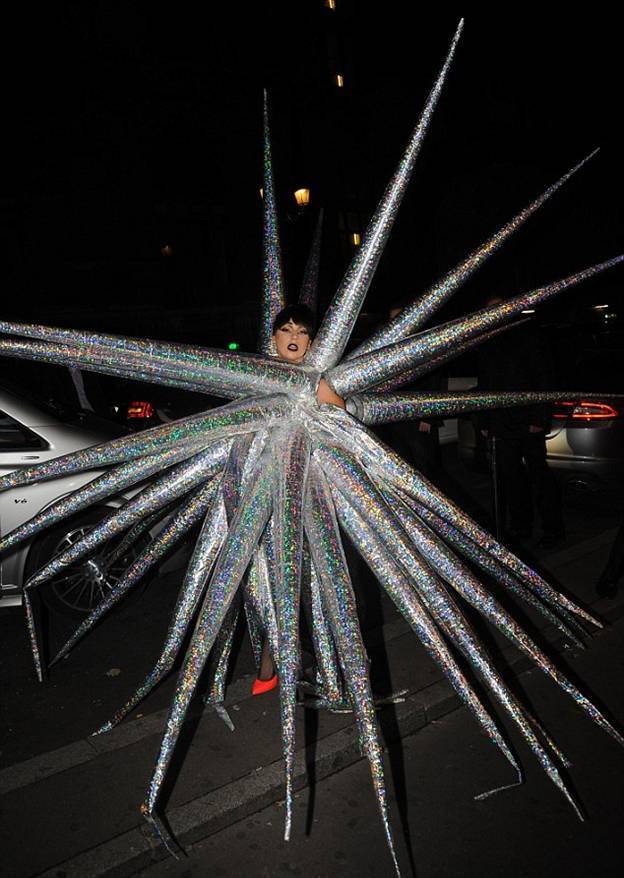 Поп-звезда появилась в Париже возле своего отеля в надувном костюме морского ежа от молодого дизайнера Джека Ирвинга. При этом наряд можно носить как надутым, так и спущенным, что певица и продемонстрировала.