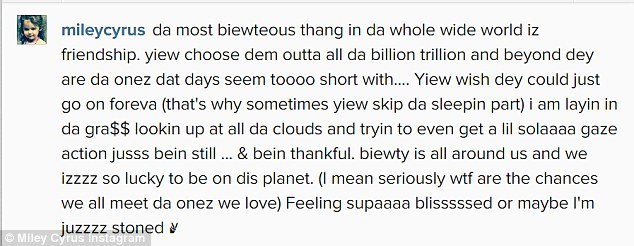 Снимок она сопроводила длинным бессвязным сообщением, которое заканчивается словами"...я juzzzz под кайфом" .