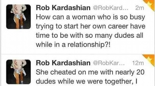 В понедельник утром в своем твиттере Роб опубликовал сообщения, в которых обвиняет Риту в многочисленных изменах. «Пока мы были вместе, она изменила мне с 20 парнями. Как это возможно? Женщина, которая занята карьерой, находит время на отношения с таким количеством мужчин, в то время, как на стабильные отношения у нее нет времени. Мне противно». Эти твитты просуществовали около получаса, после чего Роб их удалил, но было уже поздно.