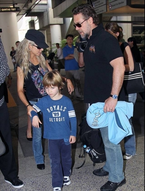 Рассел Кроу со своей семьей в аэропорту Нью-Йорка, 30 июня 2012 г