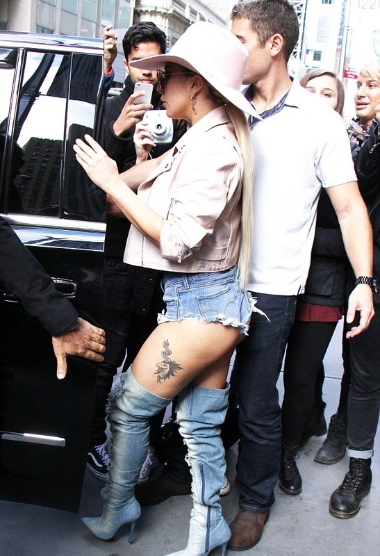 Леди Гага щеголяла в модных шортах бренда Levis, джинсовых ботфортах, бледно-розовой косухе и широкополой шляпе в тон куртке.