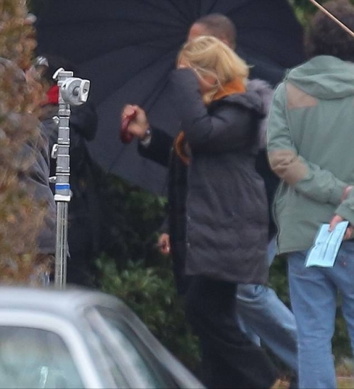 Когда Дженнифер садится в выделенную ей машину, ее прикрывают большим зонтом от съемочной группы