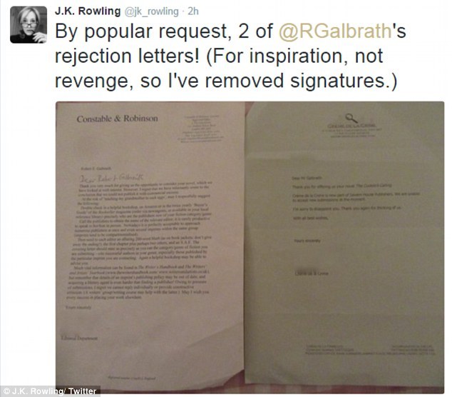 Джоан Роулинг опубликовала в сети отказы опубликовать ее детективный роман «The Cuckoo's Calling», который она написала под псевдонимом Роберт Гэлбрейт в 2013 году.