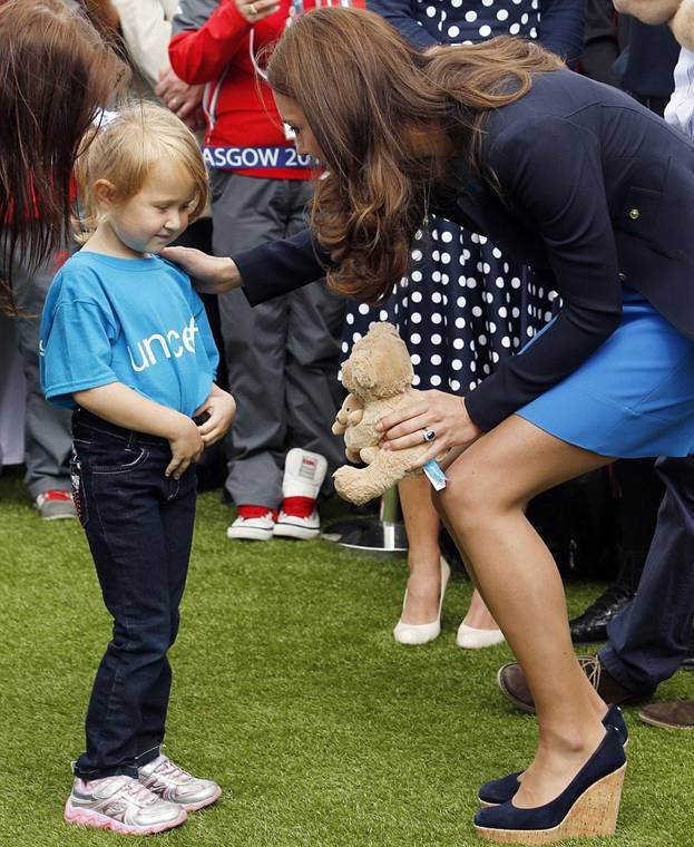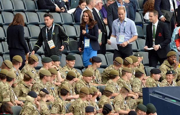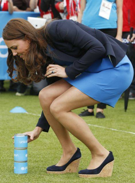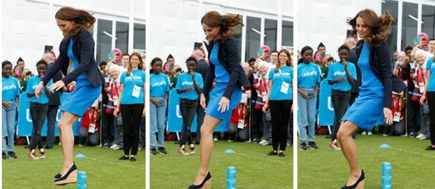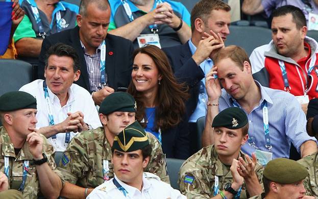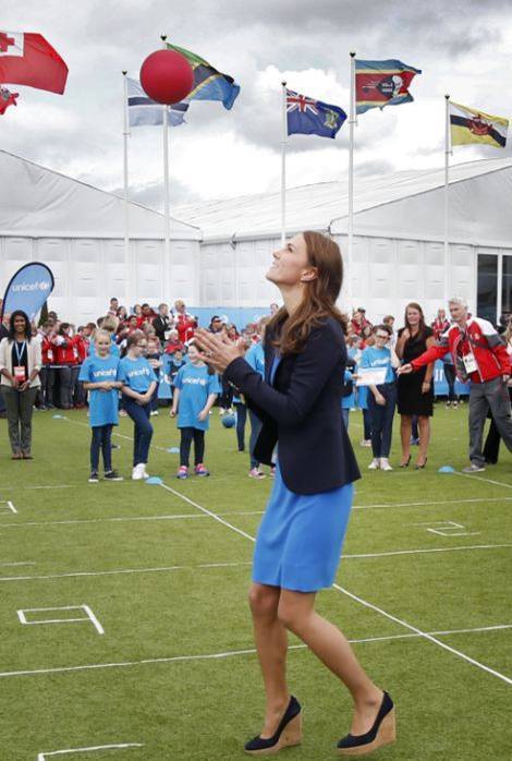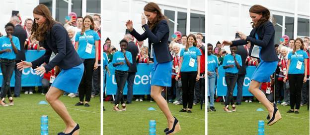 Во вторник они посетили деревню спортсменов и даже приняли участие в некоторых спортивных мероприятиях. Так, Кейт, несмотря на то, что была одета в платье от Стеллы Маккартни и босоножках на каблуках, не смогла удержаться и сыграла в игру "Три банки".