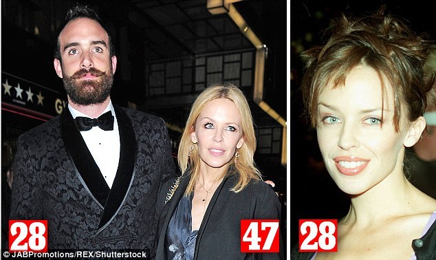 47-летняя Кайли Миноуг со своим 28-летним женихом Джошуа Зассе сейчас и в возрасте 28 лет