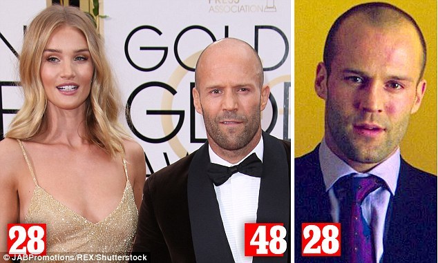 48-летней Джейсон Стэтхэм со своей 28-летней невестой Рози Хантингтон-Уайтли сейчас и в возрасте 28 лет