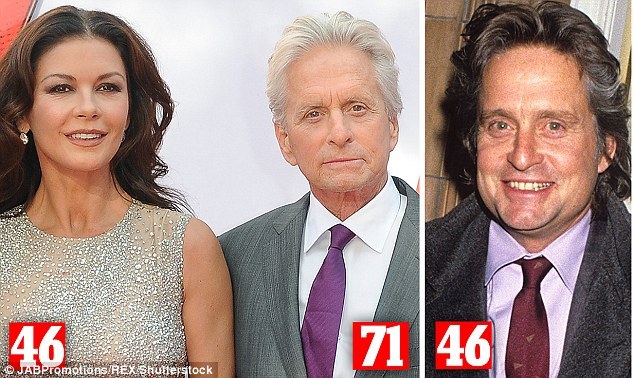 71-летний Майкл Дуглас со своей супругой 46-летней Кэтрин Зета-Джонс сейчас и в 1990 году в возрасте 46 лет