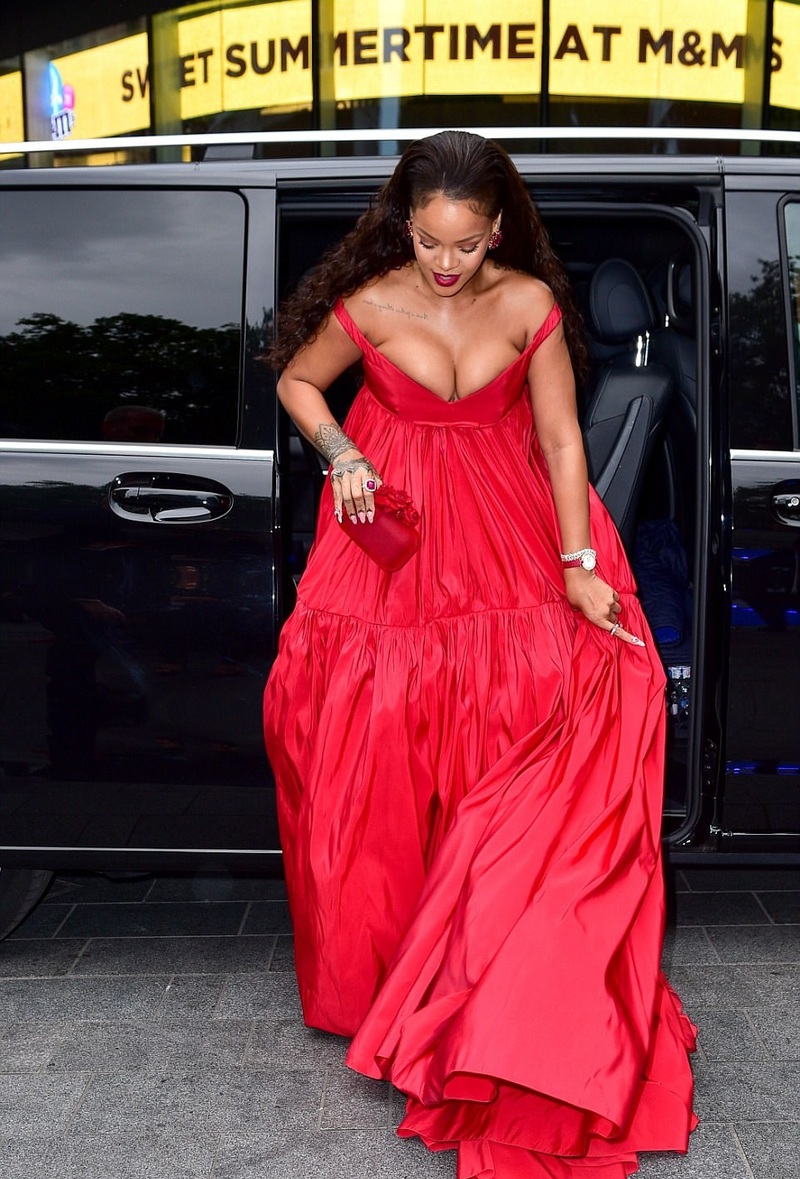 Рианна покорила гостей показа роскошным платьем от Giambattista Valli. Свой яркий образ певица дополнила украшениями Chopard, босоножками и клатчем от Jimmy Choo. Кара Делевинь для вечера выбрала черный брючный костюм от Burberry.