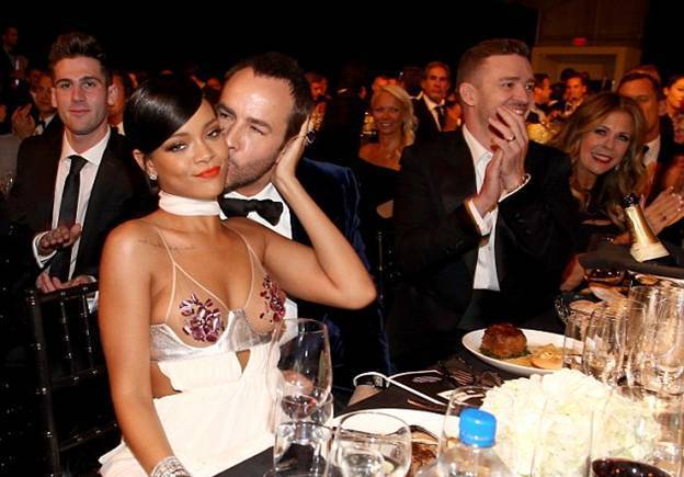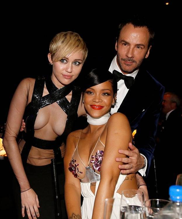 Майли Сайрус пришла на вечер со своей матерью Тиш. Рианна посетила его в одиночестве. Поп-звезда появилась в платье от Тома Форда.