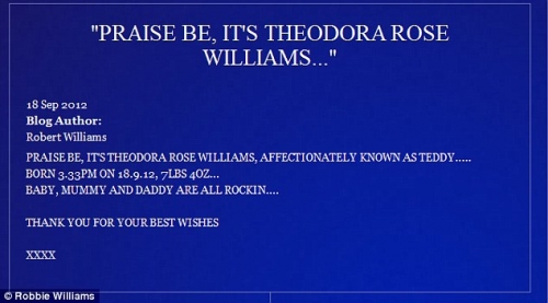 Робби Уильямс стал счастливым отцом дочери. Его супруга, Айда Филд во вторник родила здоровую девочку, которую назвали Феодора Роуз. Певец сам объявил о рождении своей дочери, через свой блог, разместив там объявление.