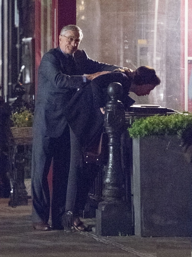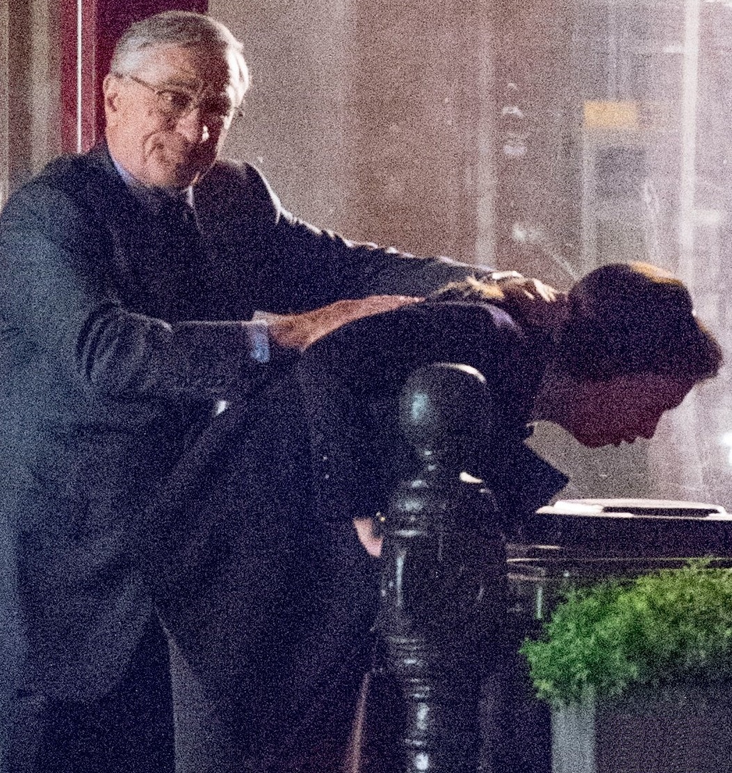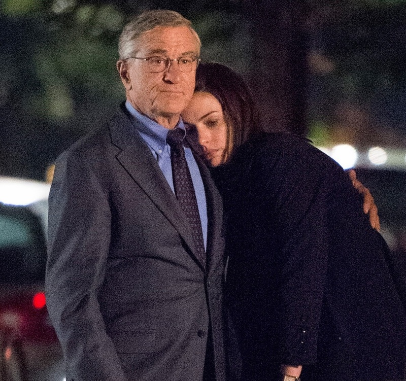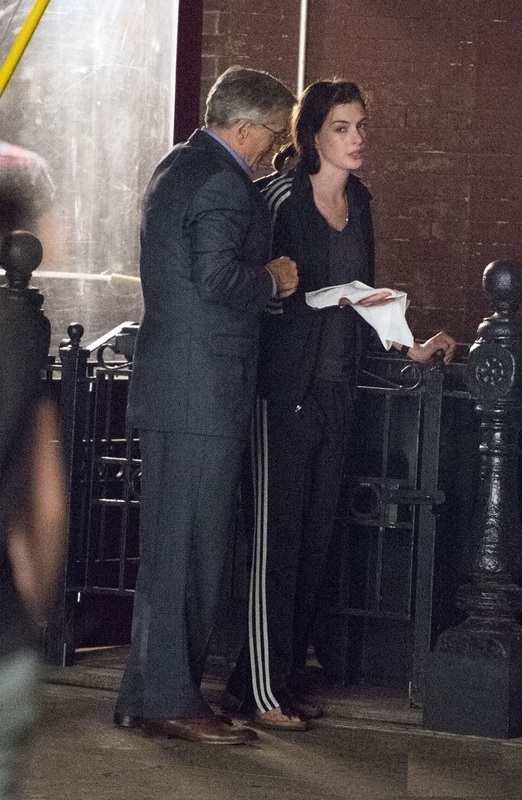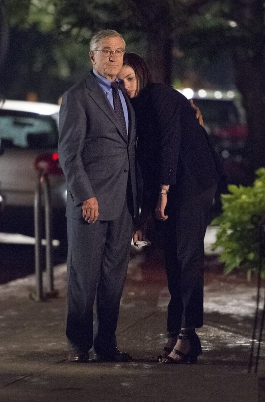 Роберт Де Ниро придерживает волосы Энн Хэтэуэй во время съемок "Интерна"