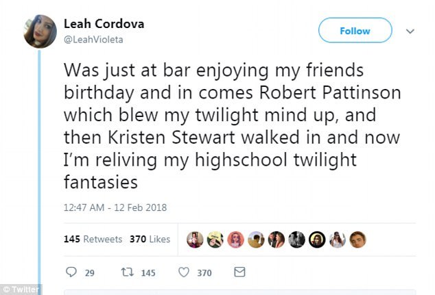 Я была в баре, отмечала день рождения друга, и тут вошел Роберт Паттинсон, а за ним Кристен Стюарт. Я вновь вернулась в школьные годы и пережила свои сумеречные фантазии.