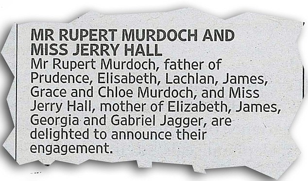 Один из самых богатых людей планеты опубликовал в своей газете TheTimes сообщение: "Г-н Руперт Мердок, отец Пруденс, Элизабет, Лаклана, Джеймс, Грейс и Хлои Мердок, и мисс Джерри Холл, мать Элизабет, Джеймс, Джорджии и Габриэль Джаггер рады объявить о своей помолвке".