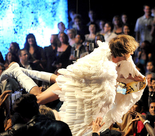 5. Одетый в белые крылья, перья и присоединенный к тросам, голым задом Саша Барон Коэн приземлился на лицо Эминема в 2009 году. Рэппер демонстративно покинул зал после происшествия, но позже признался, что это была подготовленная постановка.