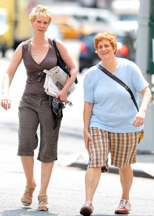 Синтия Никсон подстриглась налысо несколько месяцев назад, когда играла в бродвейской постановке Умная. И в данный момент 46-летней актриса отращивает свои волосы. Ее заметили, с короткой стрижкой, в Нью-Йорке в районе Ист-Виллидж вместе со своим мужем-женой Кристин Маринони.