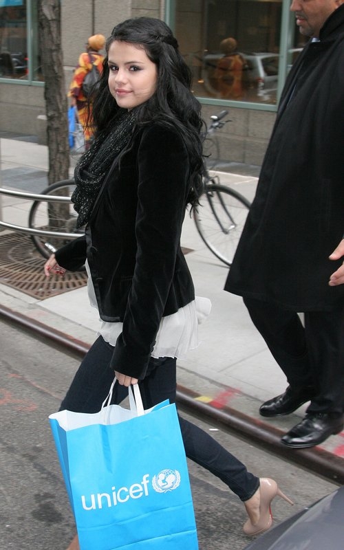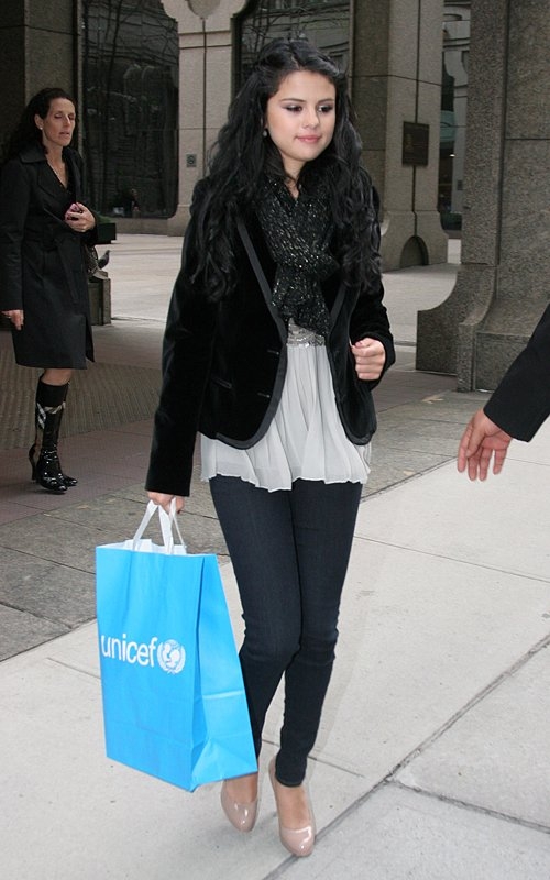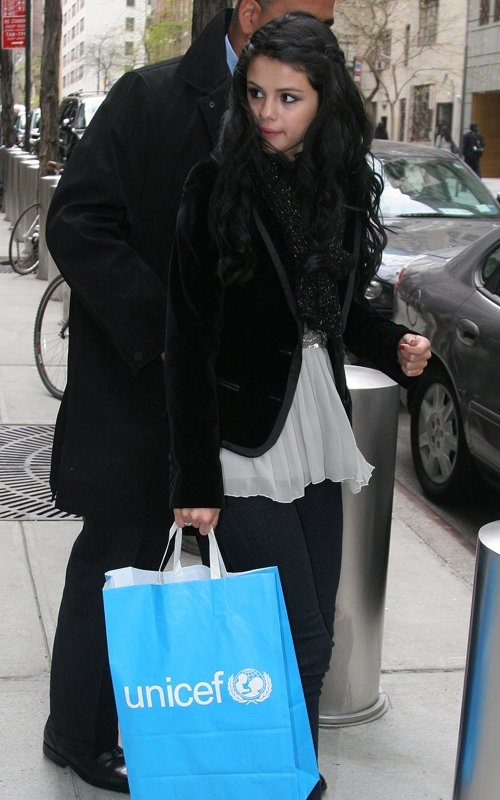 Селена выглядела очень стильно, в узких джинсах и черном пиджаке, даже большой пакет ЮНЕСЕФ не портил общего вида звезды. В Нью-Йорке Селена Гомес провела ряд встреч с детьми, как посол от ЮНЕСЕФ.