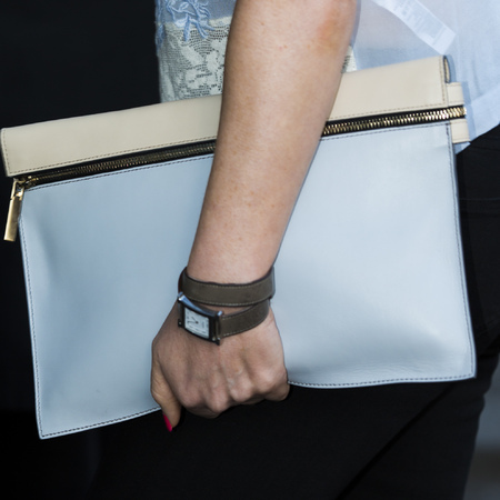 Для посещения вечера, девушка выбрала нежно-голубой клатч Виктории Бекхэм на молнии, который соответствовал цвету ее легкого голубого топа.
