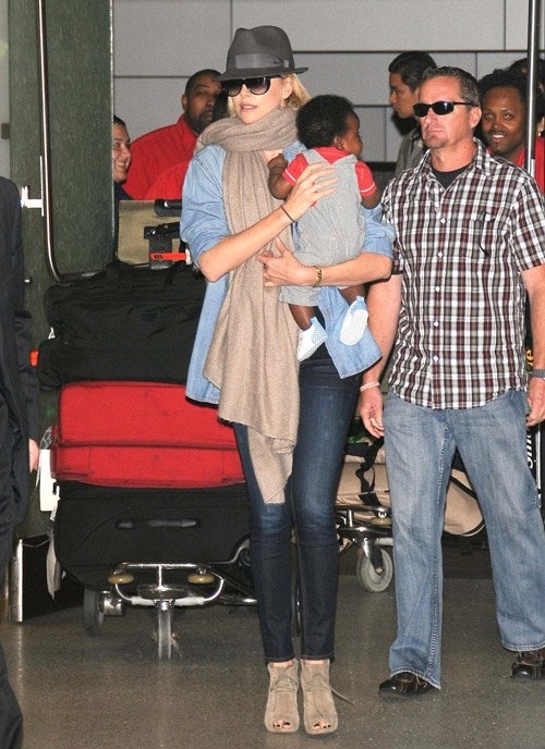 Хотя многие женщины будут содрогаться при мысли совершить длинный перелет с маленьким ребенком, актриса выглядела расслаблено и элегантно, одетая в джинсовый стиль, которому добавила шик с помощью длинного шарфа и фетровой шляпы.